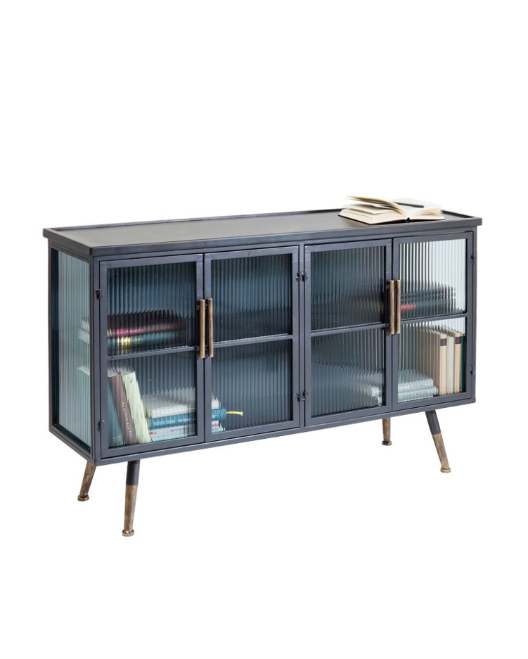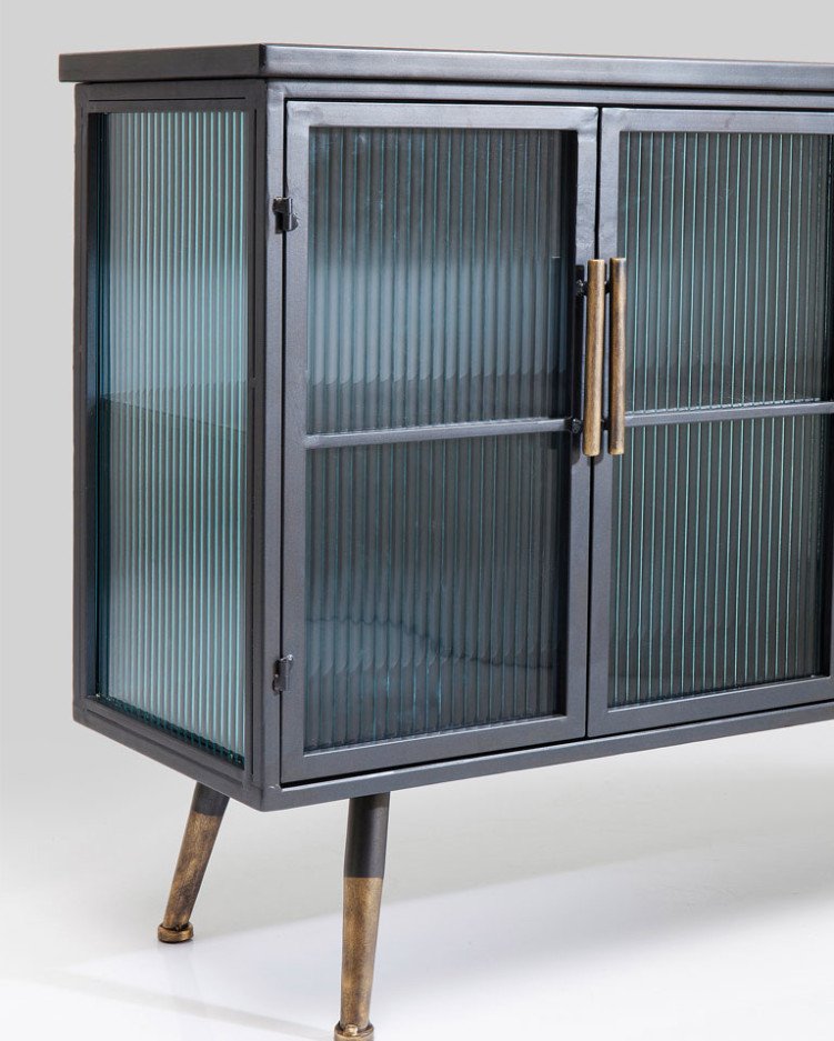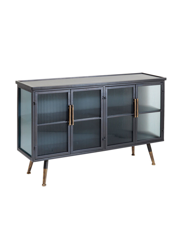 Los aparadores La Gomera son elegantes y tienen un diseño que recuerdan al industrial. Su cuerpo está fabricado en MDF lacado. Los frentes son de acero con recubrimiento en polvo y vidrio templado satinado de seguridad. Patas de acero.