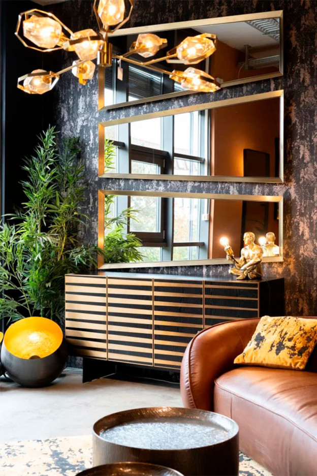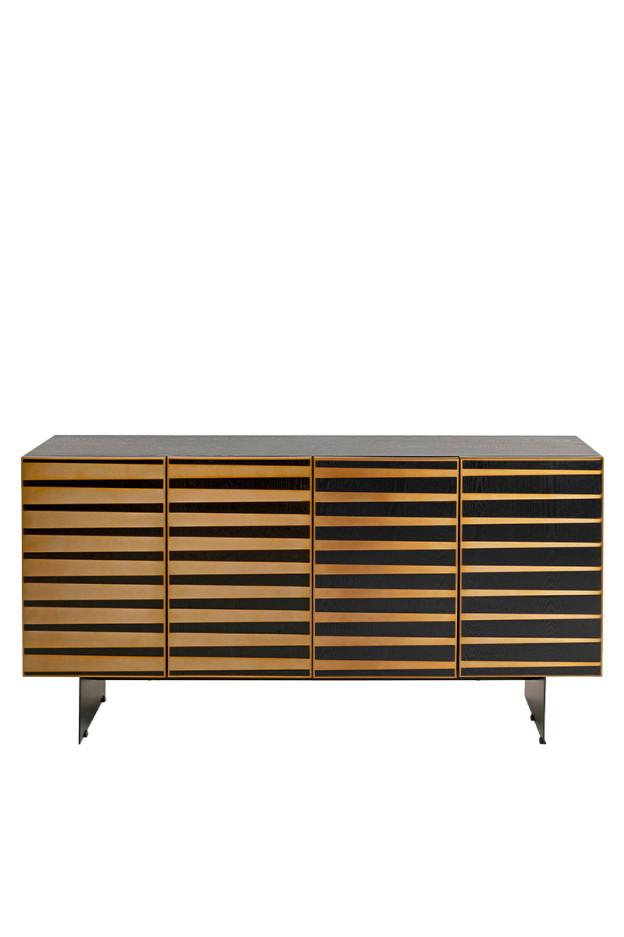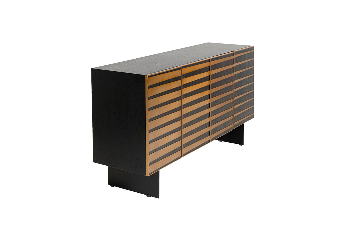 Su estructura de madera negra lacada, está realzada por detalles geométricos con acero inoxidable en acabado bronce.