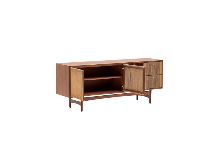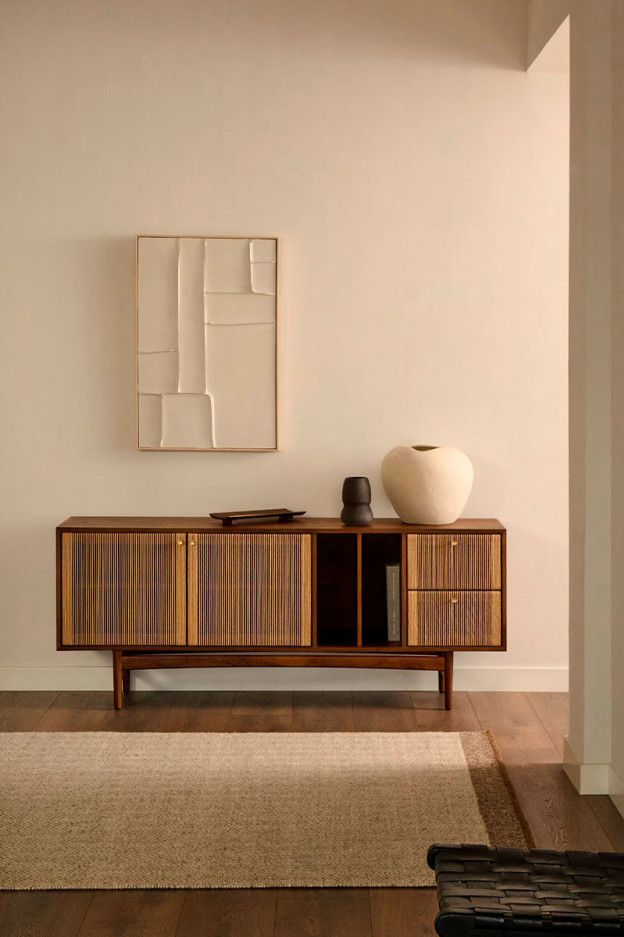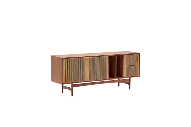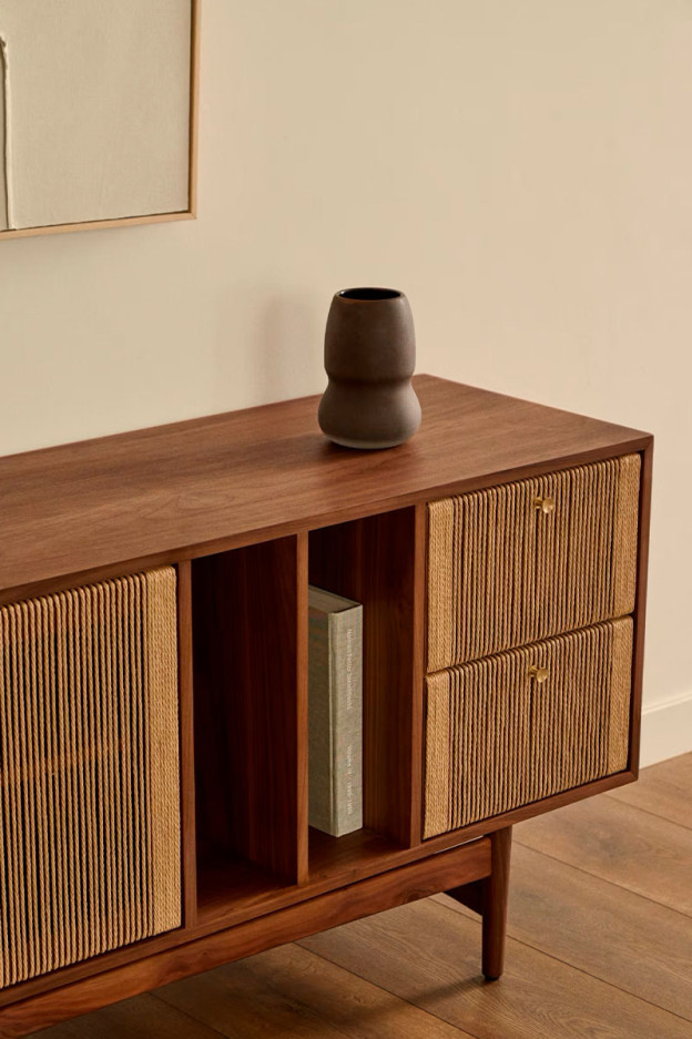 Nela es un aparador con un diseño atemporal que fusiona la calidez de la madera nogal con las cuerdas.