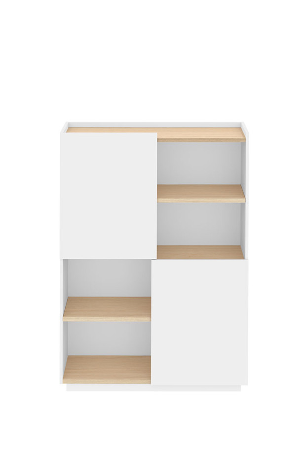 Está disponible en diferentes acabados, roble y blanco, roble y negro, nogal y negro.
