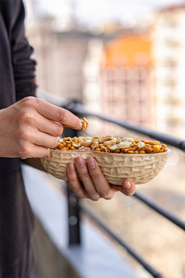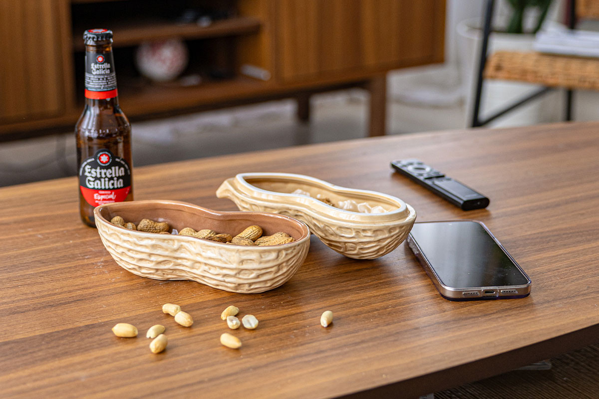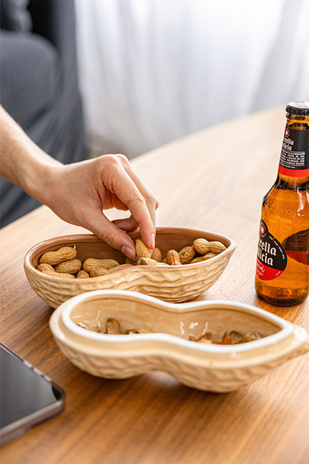 Sorprende a tus invitados con este bol de aperitivos con gran capacidad, perfecto para frutos secos. Está fabricado en cerámica y tiene una forma y textura de un cacahuete con cáscara. Puede lavarse a mano o en lavavajillas.