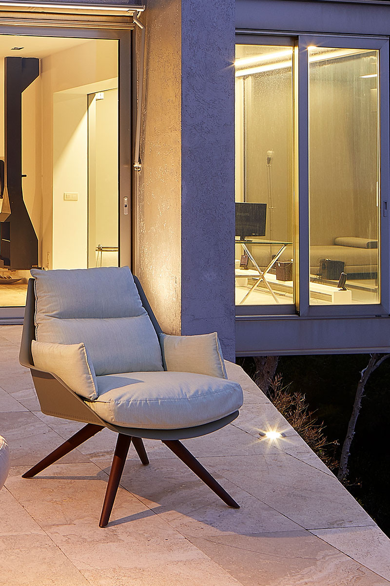 BUTACA EXTERIOR ANOUestá fabricada en polipropileno, el tejido de los cojines es un tejido Sunbrella, resistente a las inclemencias meteorológicas.