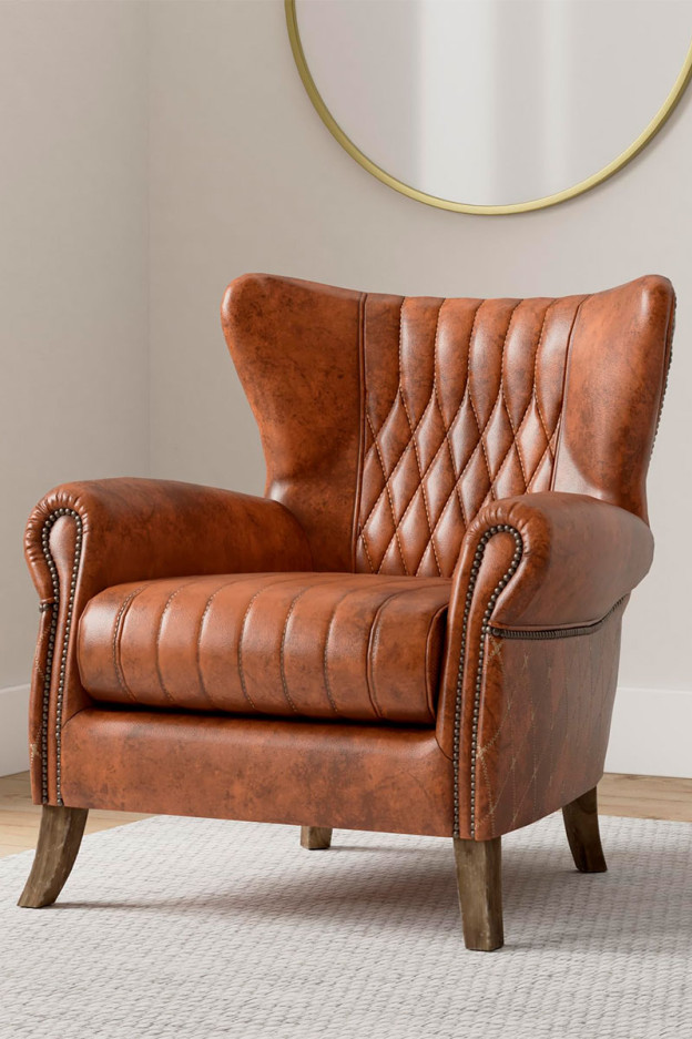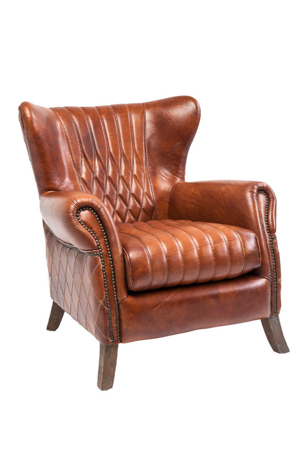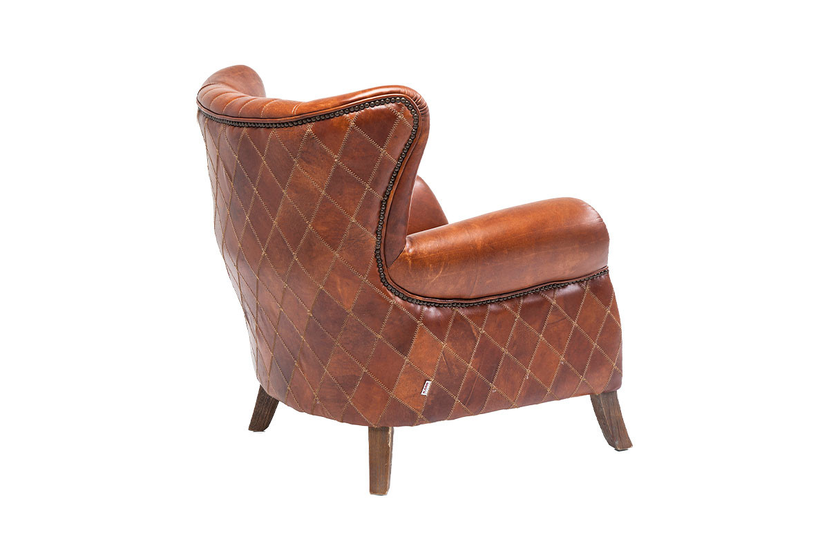 Esta butaca combina patas de madera maciza, remaches colocados a mano y costuras decorativas que realzan su carácter auténtico.
