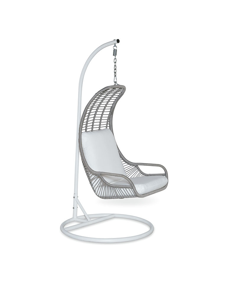 Nuestra butaca de exterior Belverde es una butaca colgante con pie. Tiene la estructura de aluminio pintada en color blanco, el sillón está trenzado con cuerda de poliéster, una cuerda altamente resistente y los cojines de asiento y de respaldo están tapizados en tejido 100% Dralon, resistente a los rayos UV, resistente a las manchas, impermeable, fácil de limpiar...y disponible en varios colores.