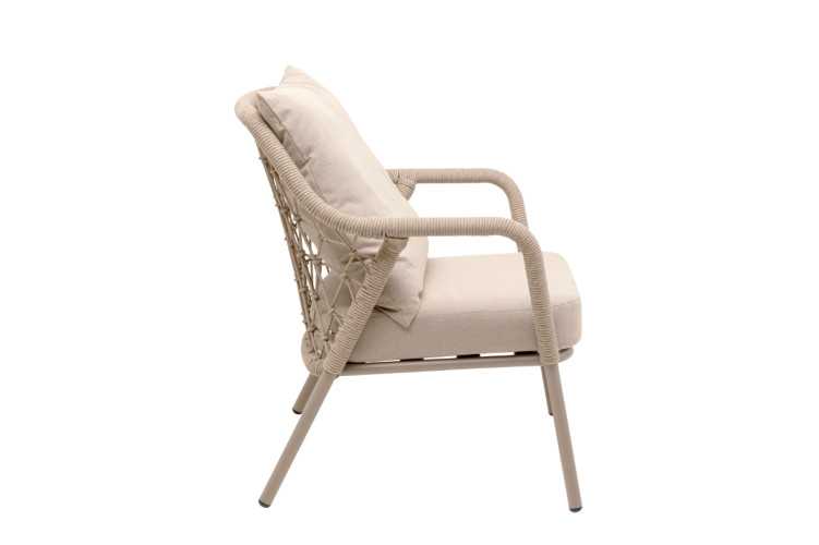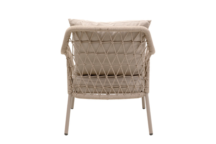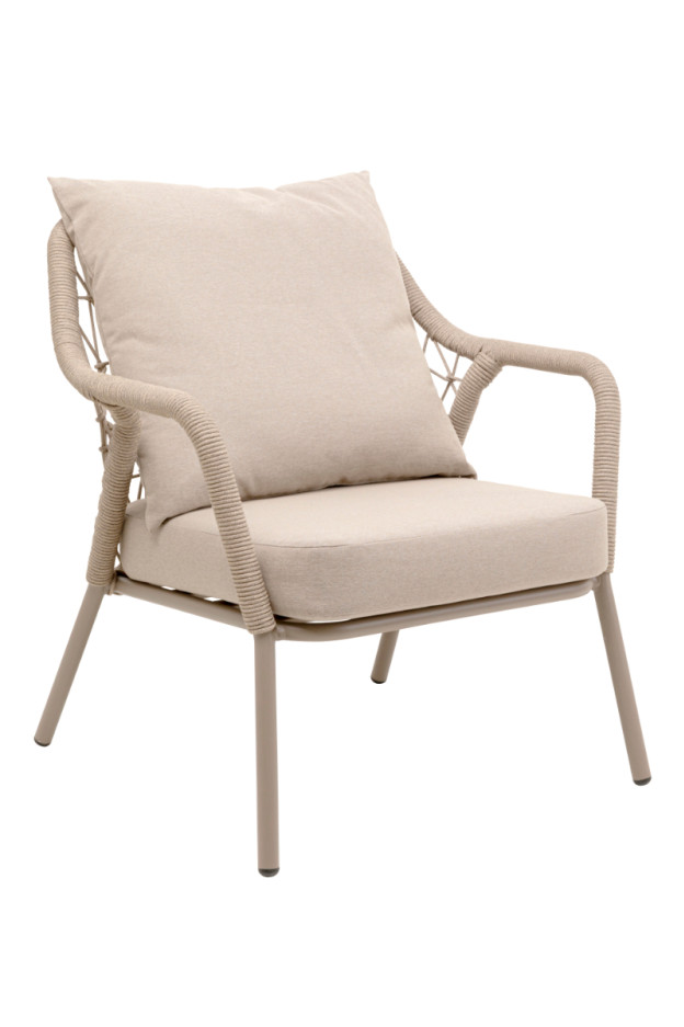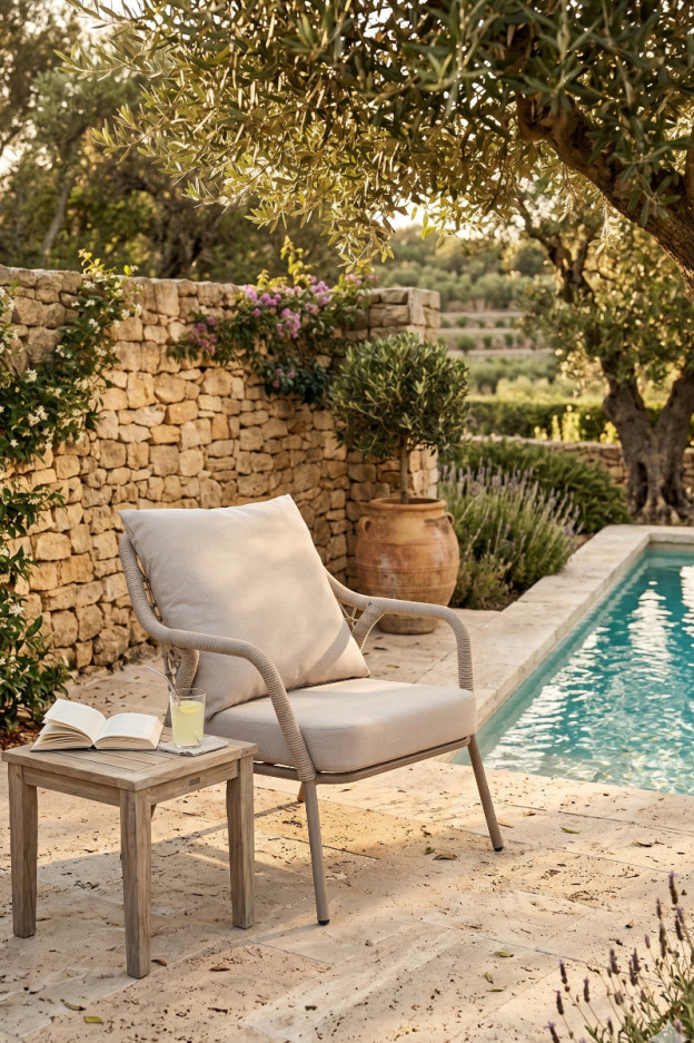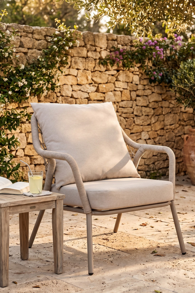 Binibeca es una butaca de exterior idónea para transformar cualquier terraza, balcón o jardín en un espacio de descanso. Gracias a su diseño contemporáneo en tonos topo y beige, aporta una estética cálida y elegante que se integra con facilidad en ambientes exteriores.