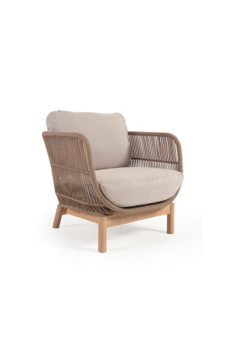 Nuestra butaca de exterior Laura tiene la estructura de madera maciza de acacia 100% FSC y cuerda trenzada a mano.
