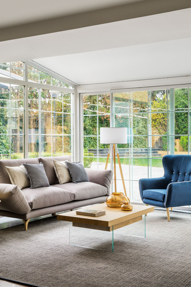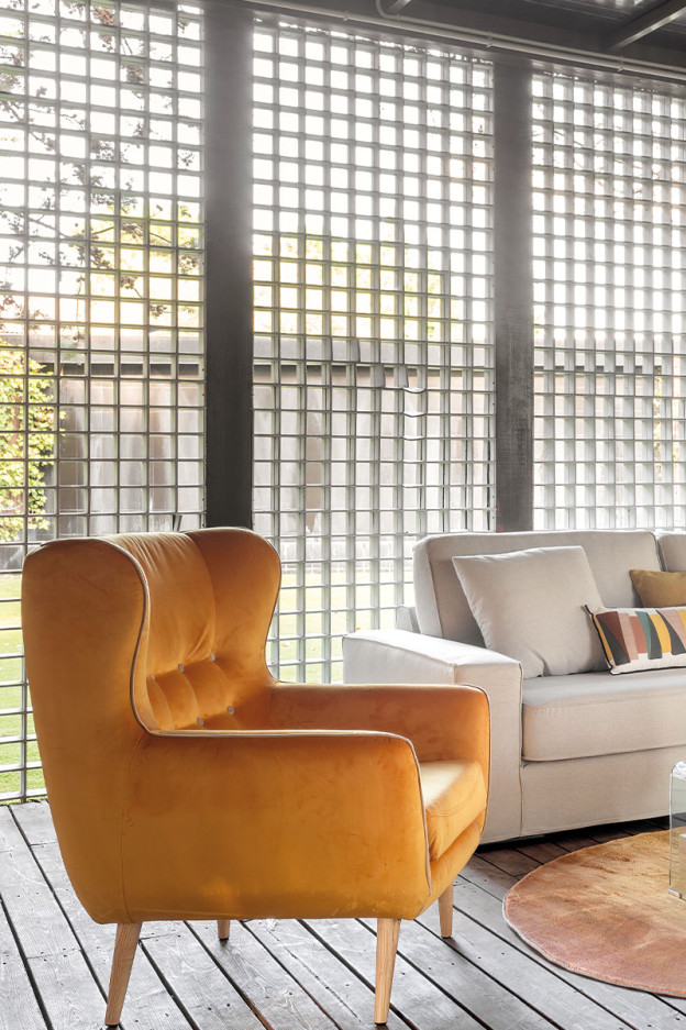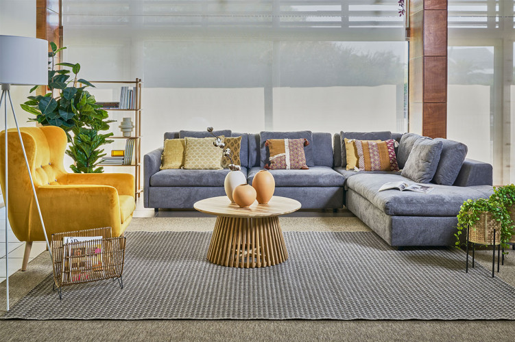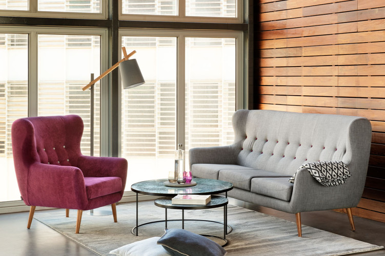 Estructura de madera maciza revestida de espuma de poliéster y fibra. Patas de madera en distintos acabados. Posibilidad de tapizar ribetes y botones en diferentes colores. Cojines desenfundables.