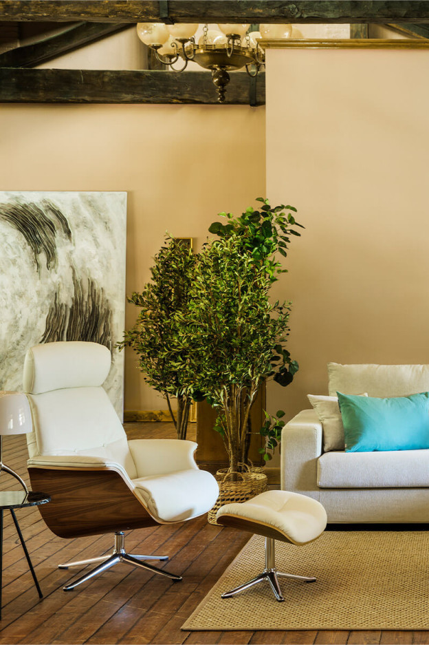 Está disponible en diferentes tapizados, incluso en piel de máxima calidad a lo largo de toda la butaca y con diferentes acabados para sus patas.