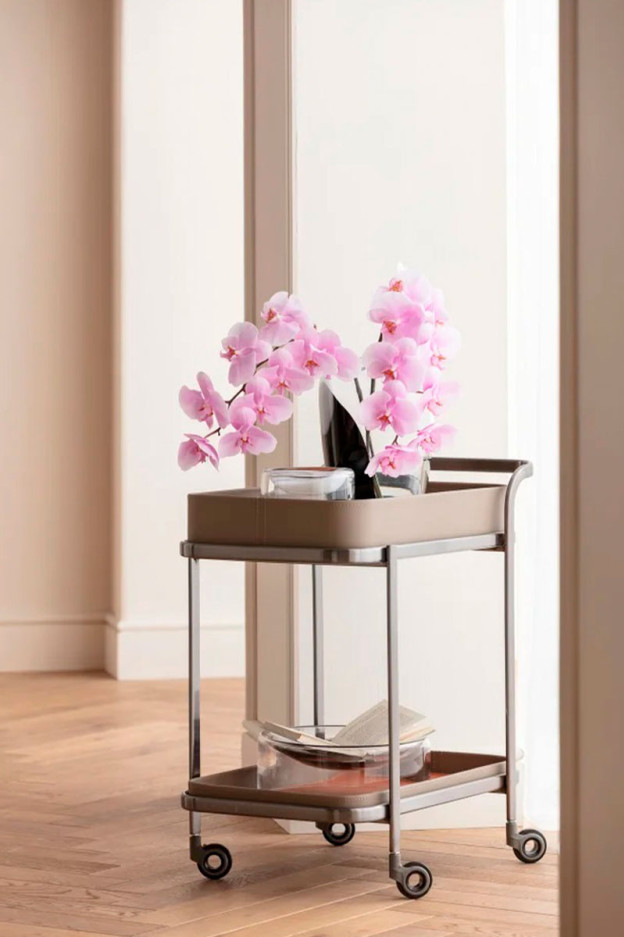 Tango es un carro de servicio que transforma cualquier rincón en un espacio lleno de estilo, funcionalidad y carácter. Su refinada superficie textil, realzada por delicadas costuras decorativas, aporta un aire sofisticado que eleva la decoración de tu hogar.