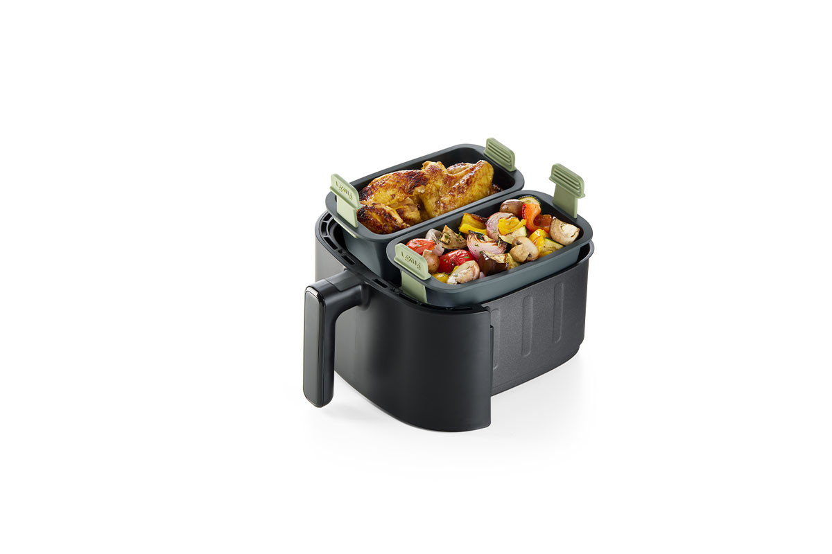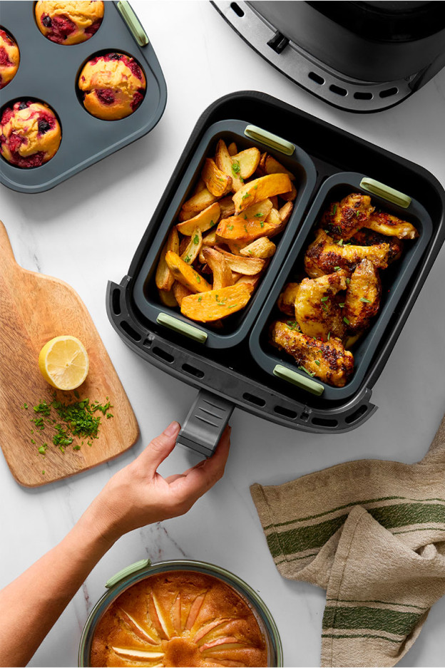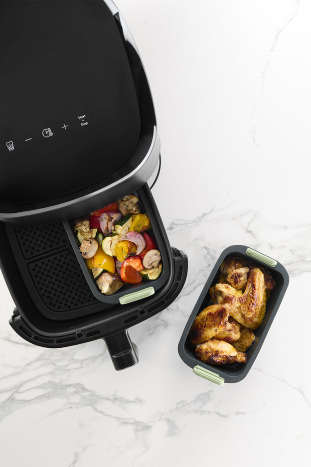 Transforma tu forma de cocinar y disfruta de una experiencia más fácil, limpia y deliciosa. Esta cesta rectangular ha sido diseñada para que saques el máximo partido a tu freidora de aire y a tu creatividad en la cocina. Si quieres cocinar de manera simultánea dos recetas a la vez, es posible utilizando dos cestas.