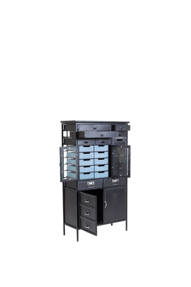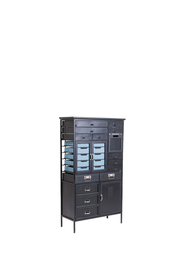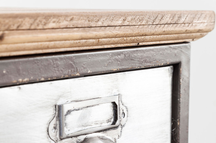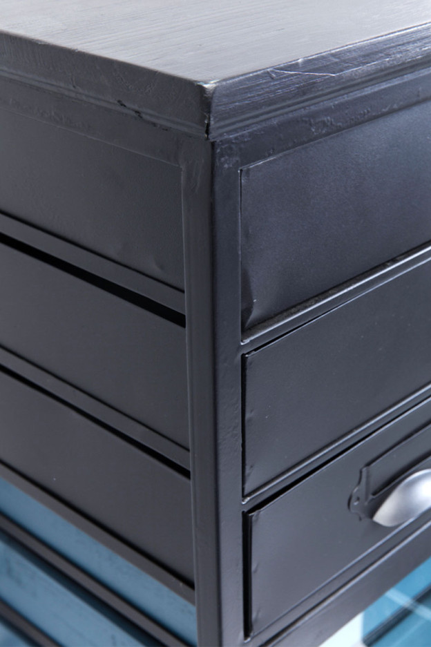 Cuerpo de acero con recubrimiento de polvo y madera de abeto lacado. Cajones de madera de abeto y chapa de acero.