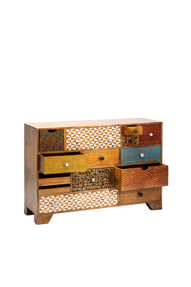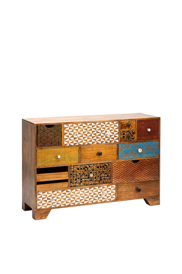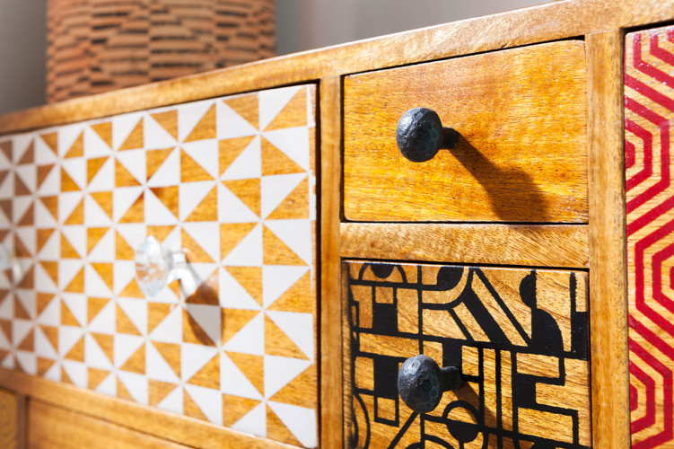 La funcionalidad está servida con la cómoda Soleil. Un mueble de diseño exclusivo con toques de originalidad. Guarda y ordena tus objetos y prendas de una forma más cómoda gracias a su capacidad de almacenamiento. Cómodas realizadas en madera de mango lacada.