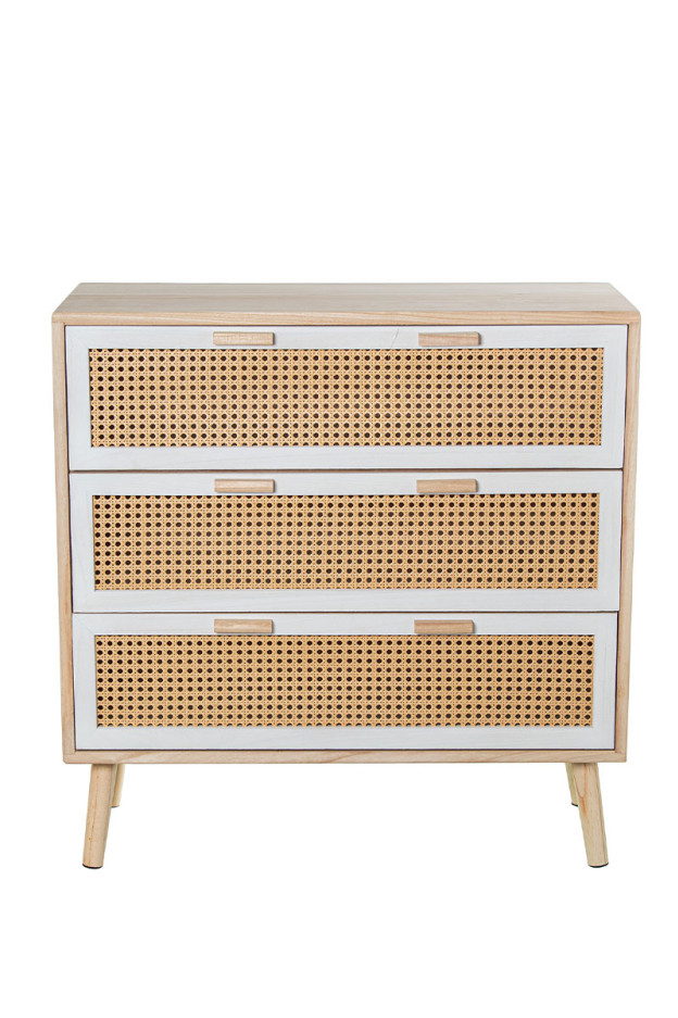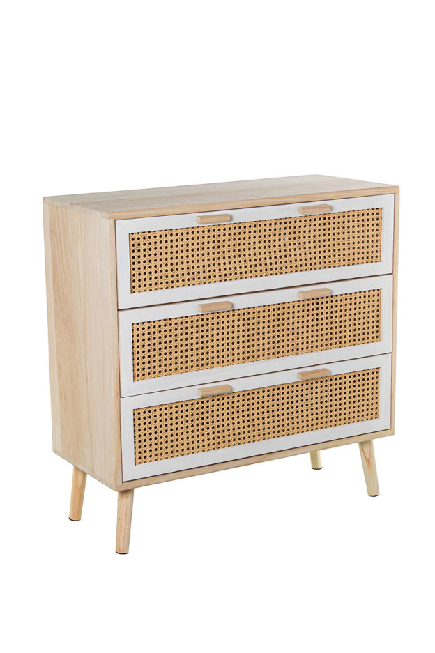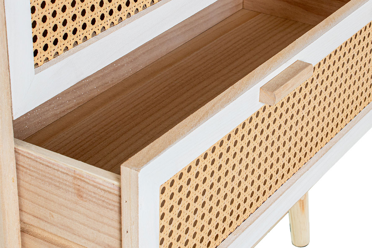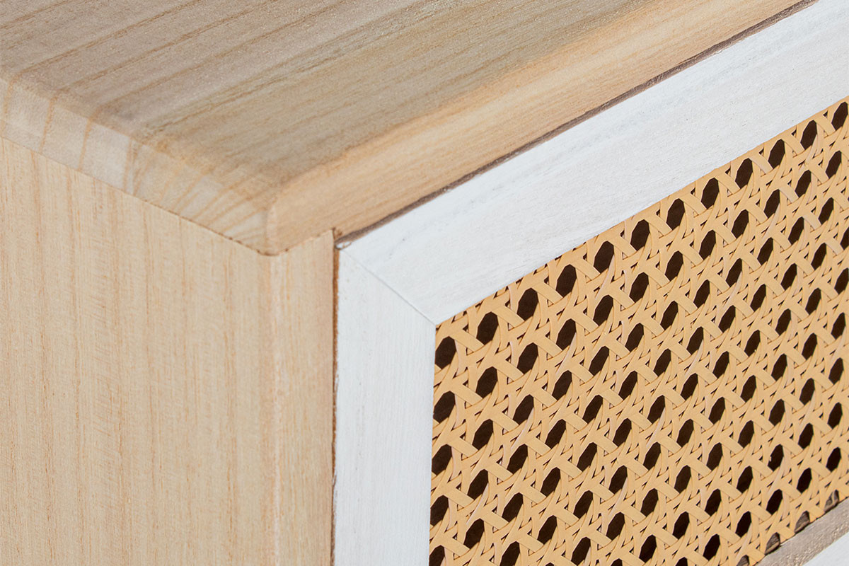 Está fabricada en madera de paulownia y dm. Con detalles en mimbre.