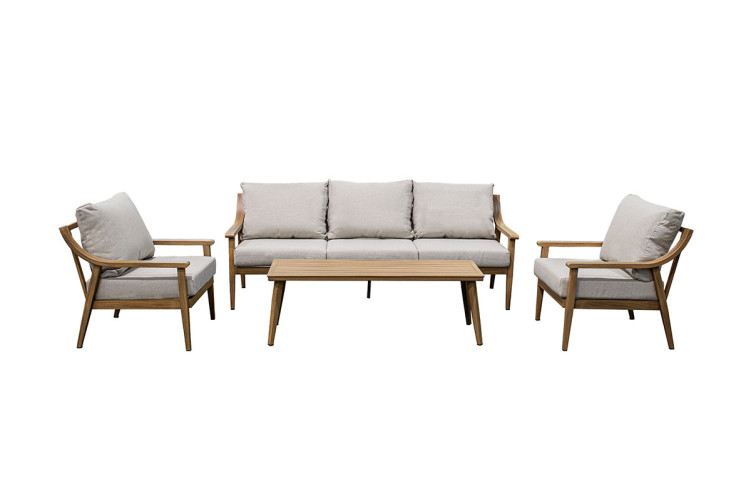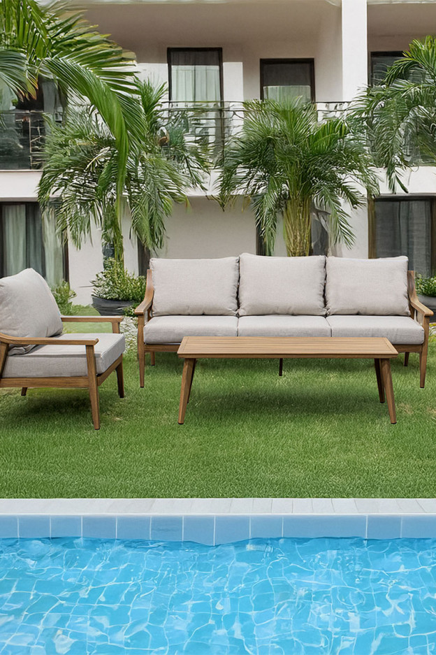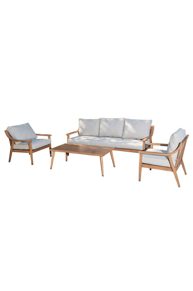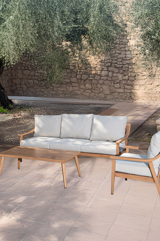 Lausana es un conjunto de muebles de exterior diseñado para transformar tu terraza o jardín en un refugio de estilo, calma y confort. Este conjunto está compuesto por un sofá de 3 plazas, dos butacas, y una mesa de centro, un set ideal para compartir momentos al aire libre en la mejor compañía.