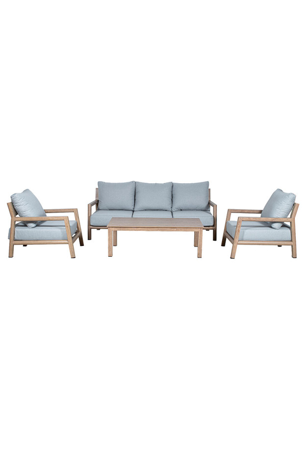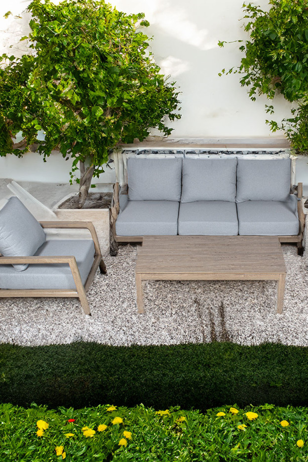 Santa Lucía está compuesto por dos sillones, un sofá de tres plazas y una mesa de centro, mobiliario idóneo para una terraza de un piso.