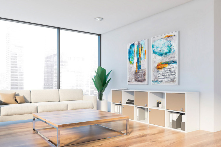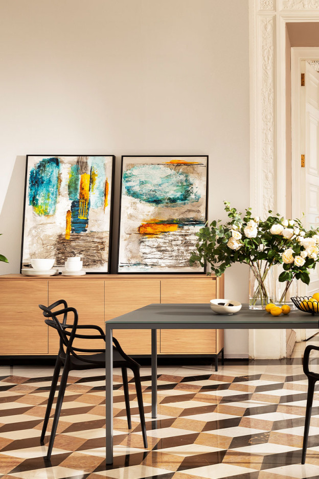 Disponible sin marco, con marco lacado en color blanco, lacado en color negro o chapado en roble.
