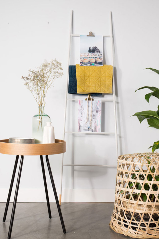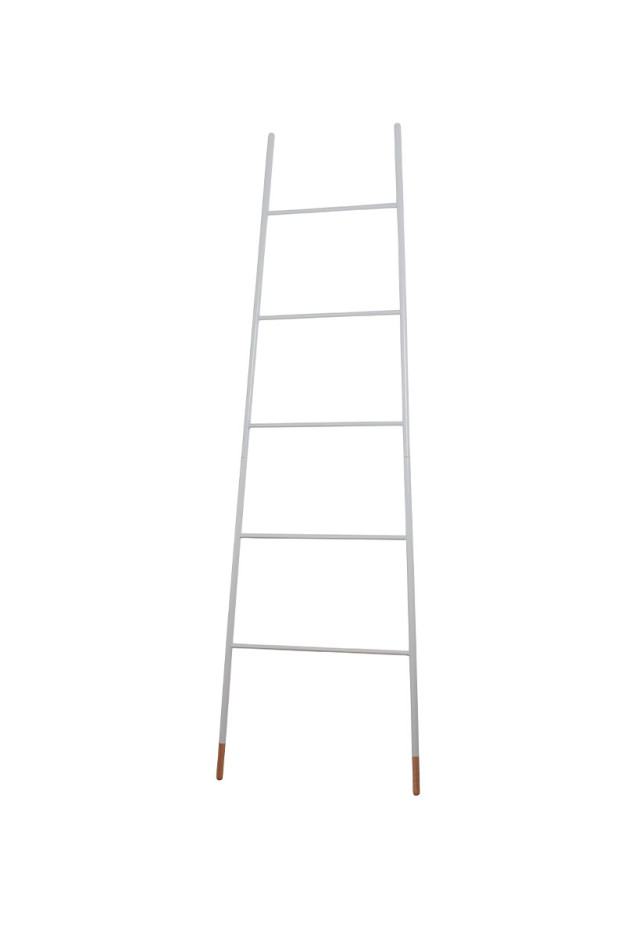 Escalera que se apoya sobre la pared y puedes guardar tus revistas o mantas. Acabado en lacado blanco y pies de caucho. Medidas: 37/54x2x175 cm.