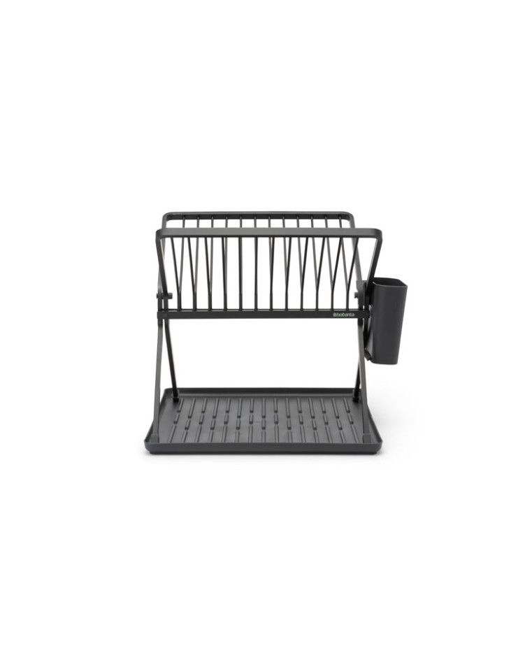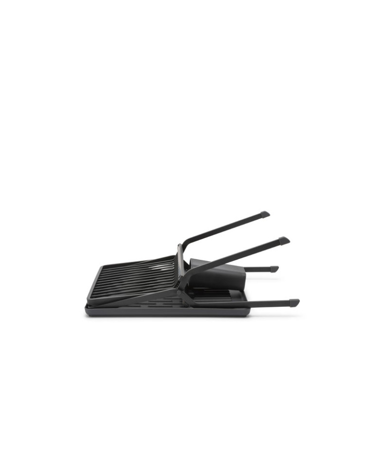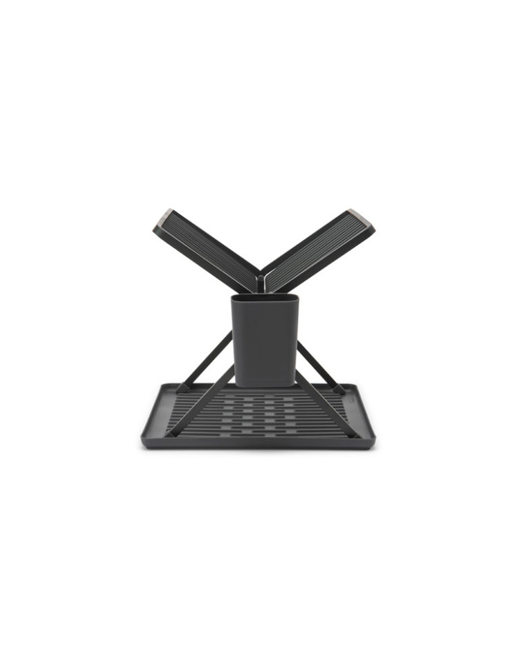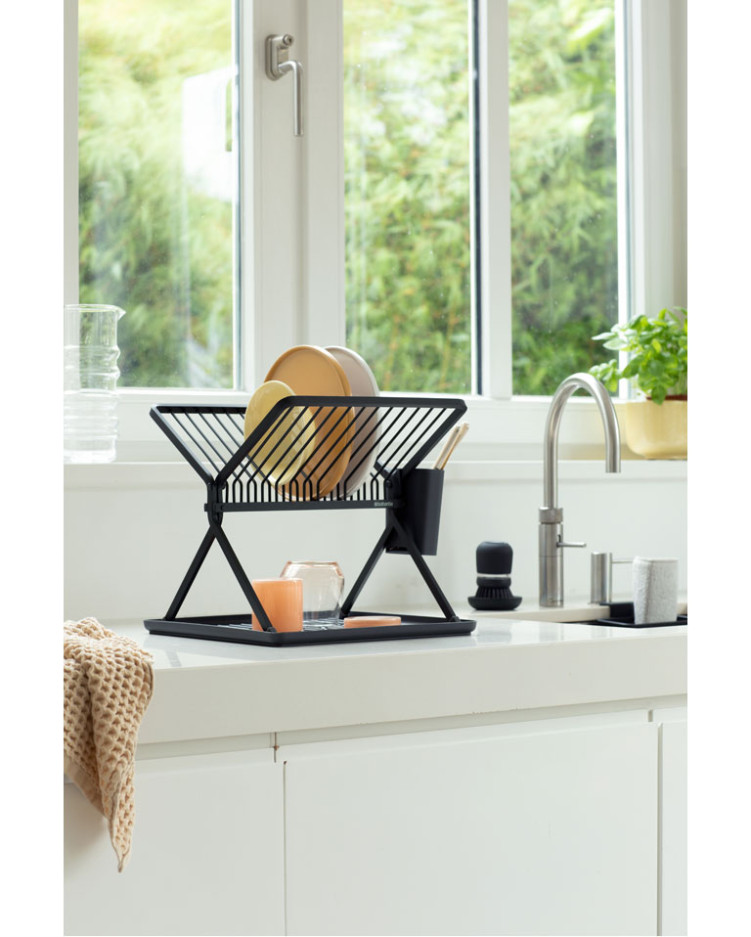 Escurreplatos plegable de diseño con recipiente extraible para los cubiertos y bandeja recogegotas. Fabricado en un 35% de material reciclado. Es un 96% reciclable tras su uso. No resbala ni raya gracias a sus topes de silicona.