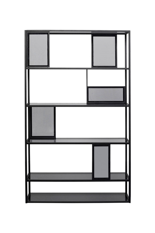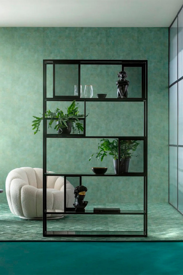 La estructura se encuentra fabricada en acero y los estantes en vidrio en acabado ahumado, confiriendo profundidad y carácter a la estancia.