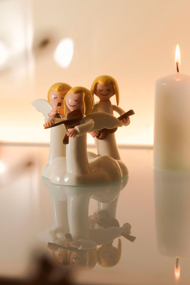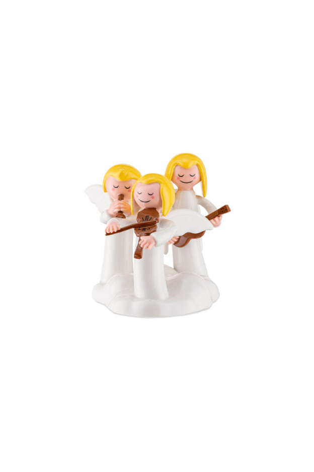 Encantadora figura que representa a tres angelitos músicos sobre una nube. Cada uno sostiene un instrumento violín, flauta y guitarra creando una escena llena de armonía y dulzura.