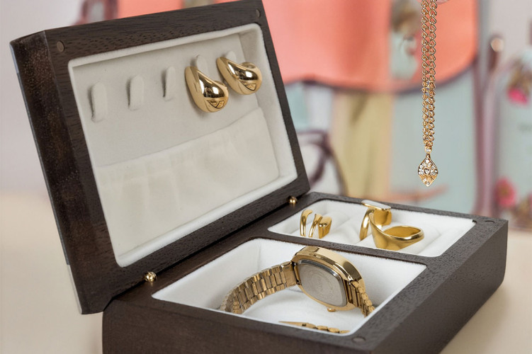 Cuenta con 5 ganchos, un bolsillo, 4 ranuras para anillos y un compartimento libre, para que cada pieza tenga su lugar y siempre estén protegidas.