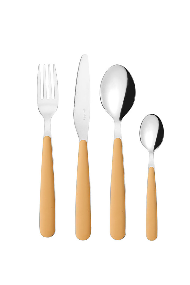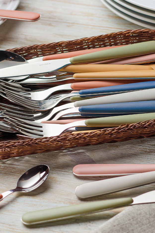 Pop es un juego de 24 cubiertos que se compone por 6 cuchillos, 6 tenedores, 6 cucharas y 6 cucharillas.