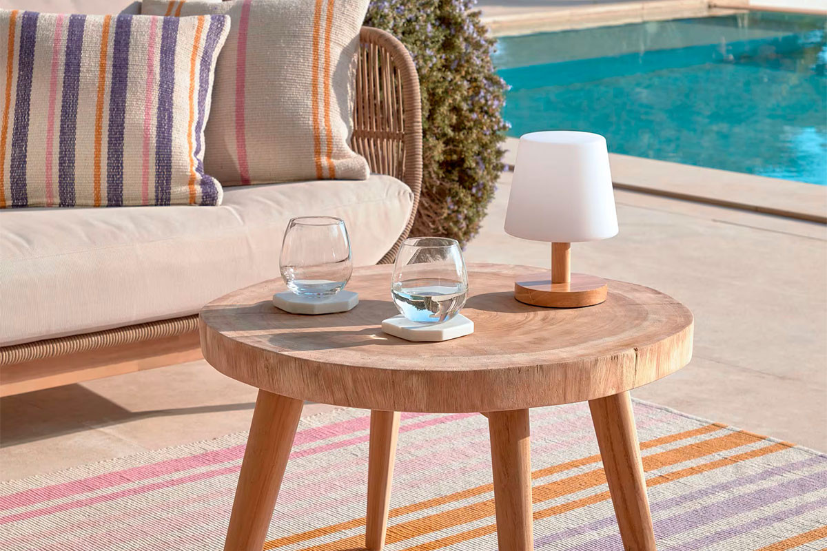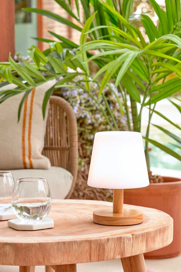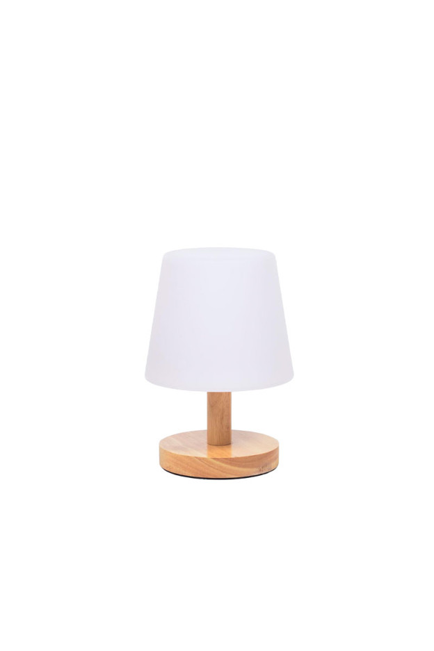 Nuestra lámpara de mesa Aika es una lámpara portátil con el pie de madera en acabado natural y la tulipa de polietileno.