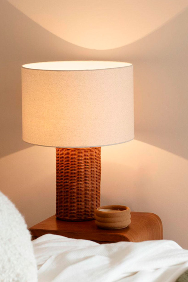 La estructura de la lámpara está fabricada en ratán y hierro, mientras que su pantalla en lino, en un acabado beige.