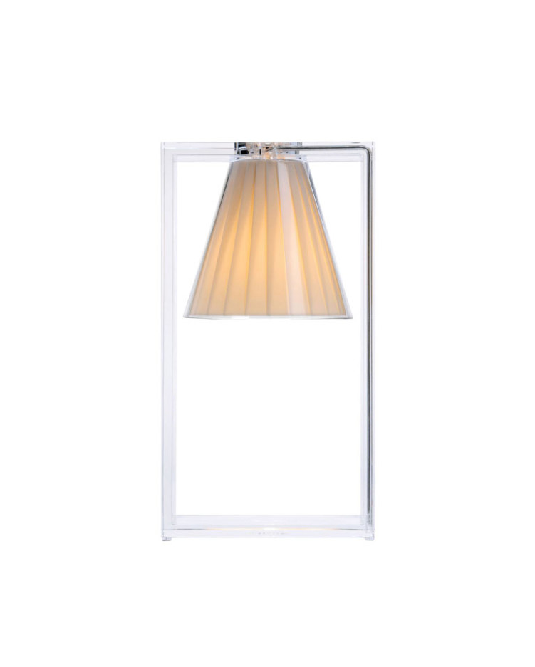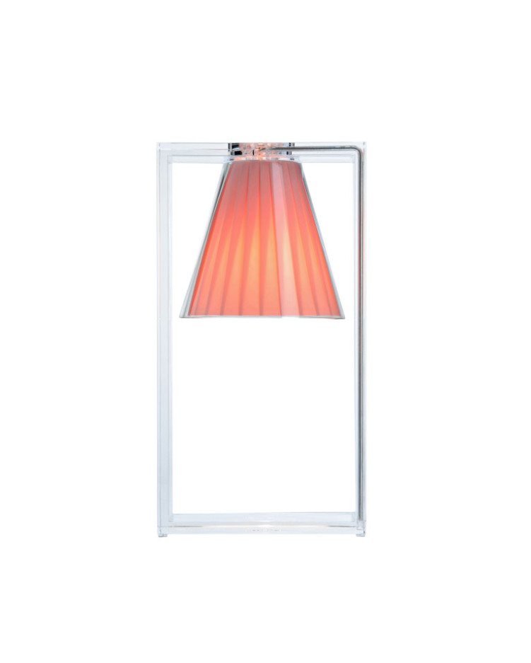 Light-Air nace como una lámpara de mesa “ilusionista”, una luz suspendida que escapa a la ley de la gravedad. Es básica, moderna y racional, pero al mismo tiempo, produce un efecto mágico. Su estructura es una fuerte marca gráfica, formada por un marco rectangular en tecnopolímero termoplástico transparente, que alberga en su interior el difusor, una parábola cónica con un interior en tejido plisado, en tres colores pastel diferentes. Medidas: 17x14x32 cm. Diseño de Eugeni Quitllet.