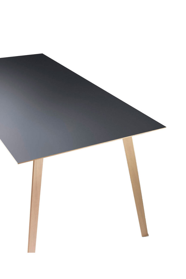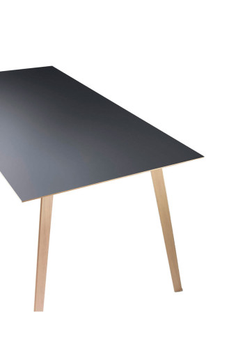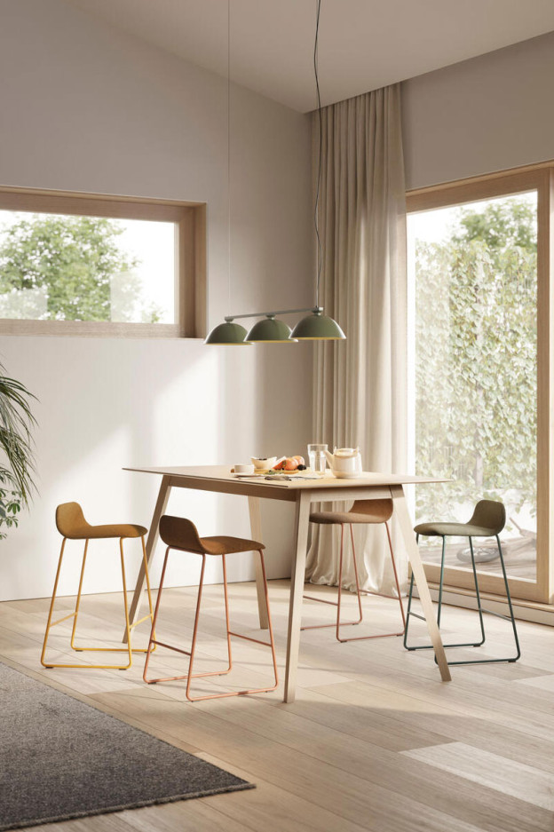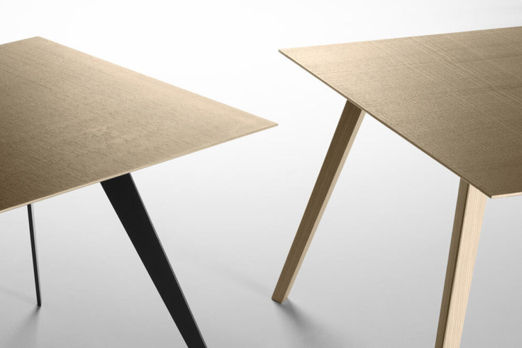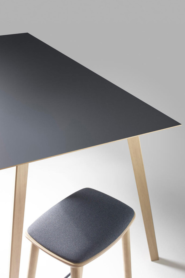 Mesa AISE en versión alta. Un elemento importante de la mesa AISE en su diseño es el grosor de la encimera, que visualmente apenas alcanza el medio centímetro. Patas de madera disponibles en roble o nogal. Sobre de madera o de fenix disponible en varios acabados.
