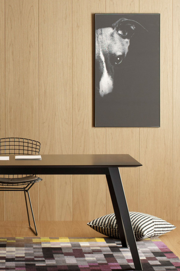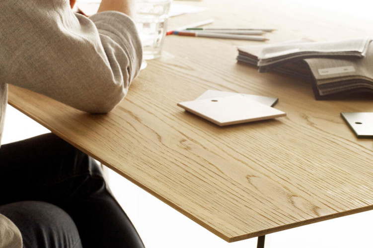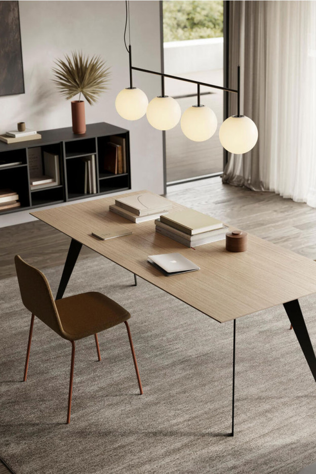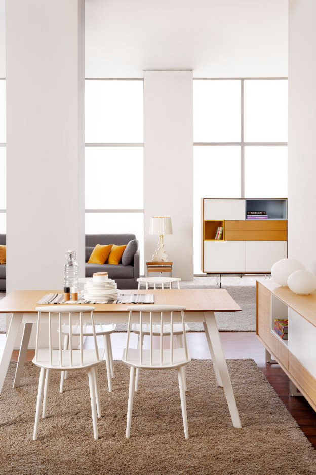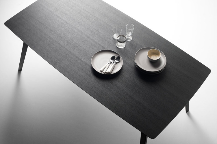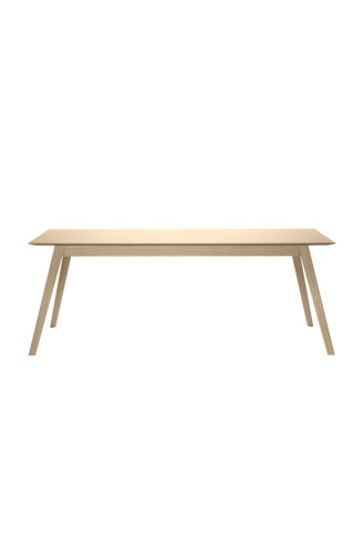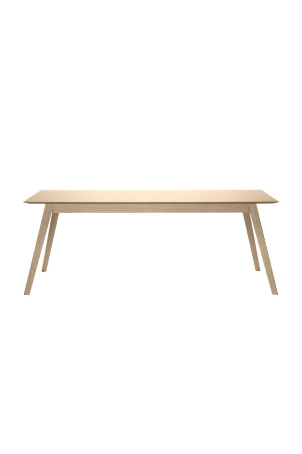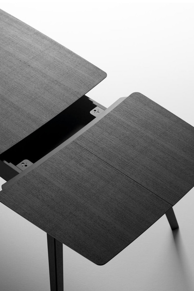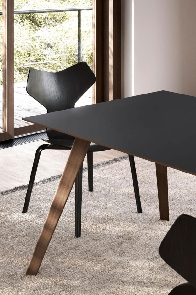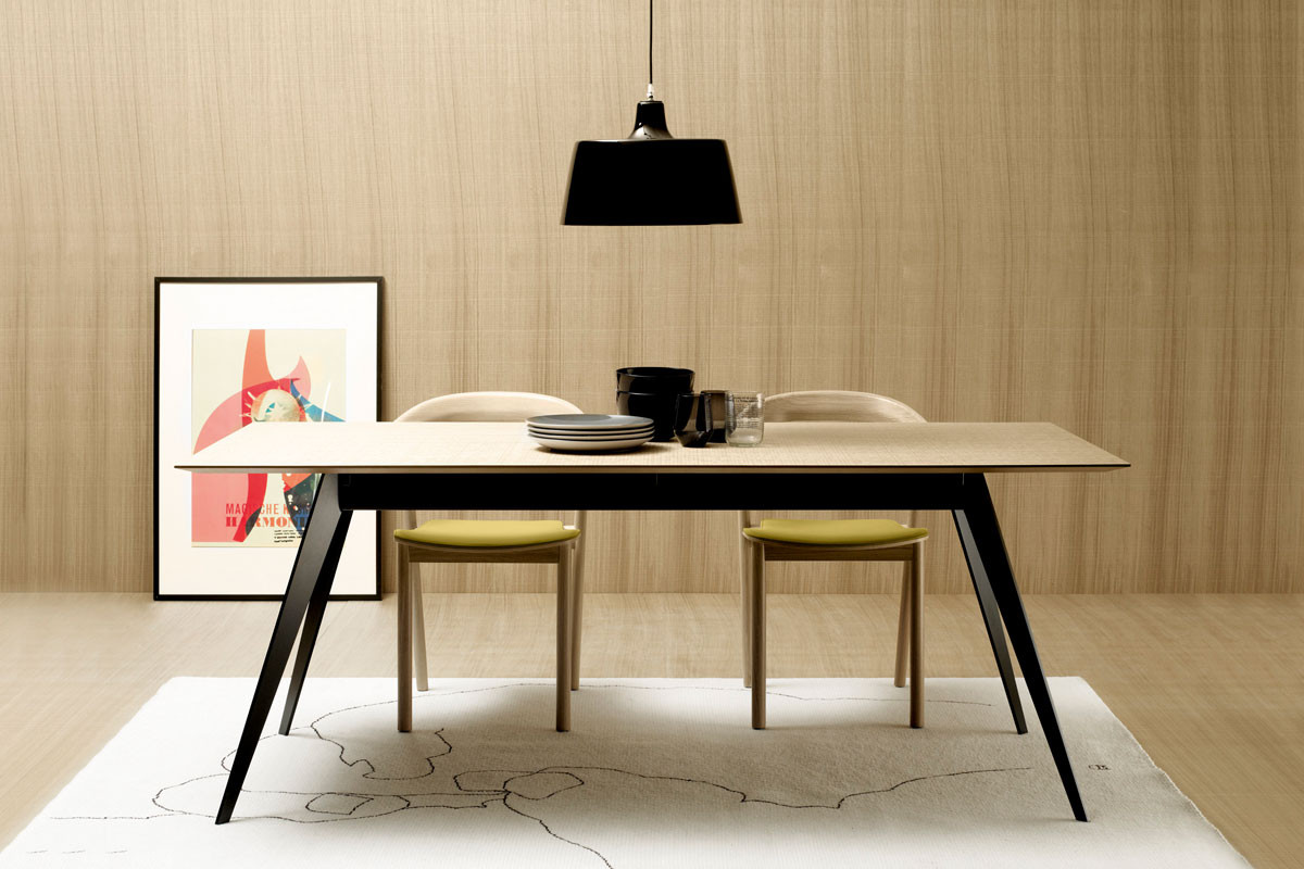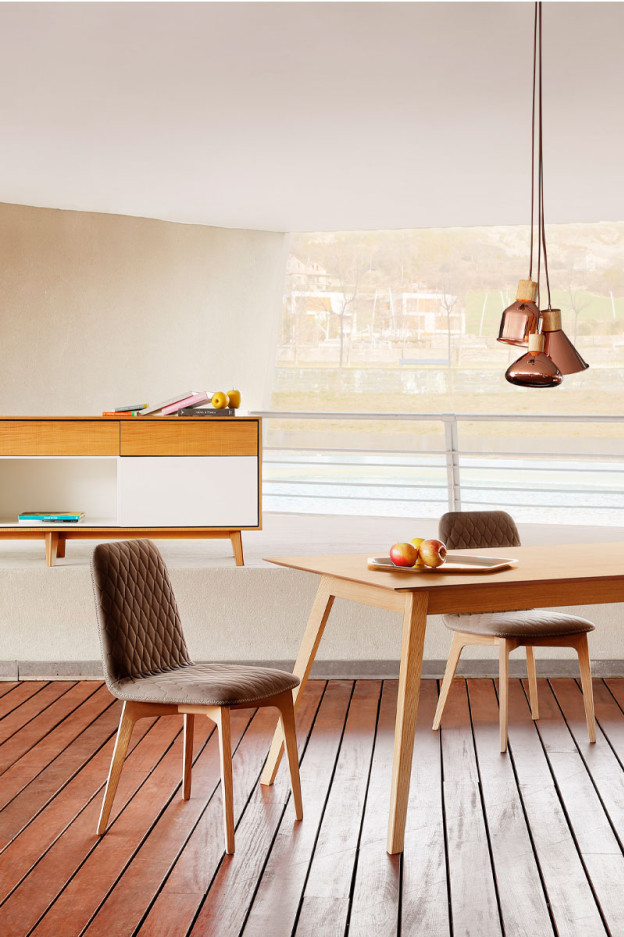 Mesa de comedor AISE, se caracteriza por su ligereza visual y su sólida construcción. Un elemento importante en su diseño es el grosor de la encimera, que visualmente apenas alcanza el medio centímetro. Mesa con sobre de madera y patas de madera en roble o nogal. Fija o extensible.