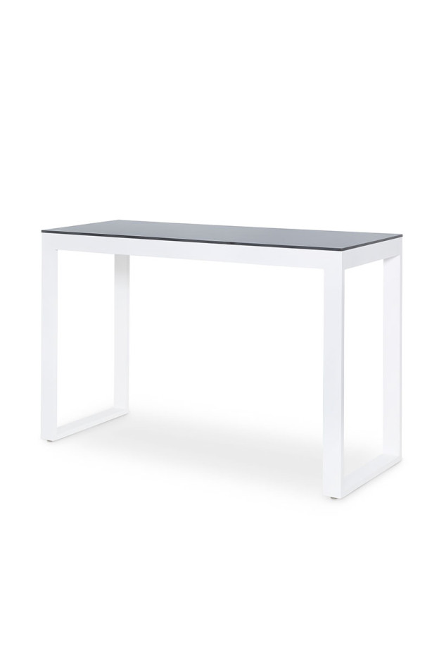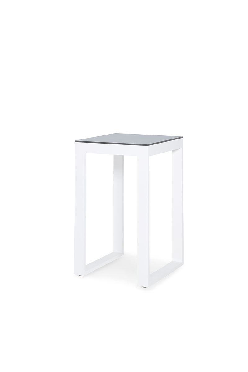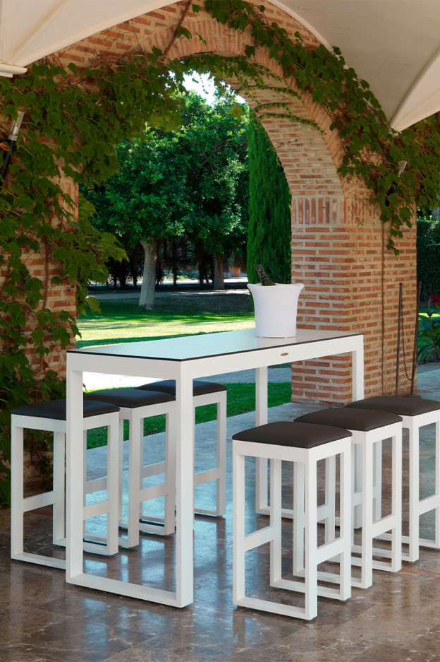 Nuestra mesa alta para exterior Baeza tiene la estructura de aluminio termolacado en color blanco y el sobre es un tablero de HPL, resistente a la humedad, a la intemperie y a los rayos ultravioletas.