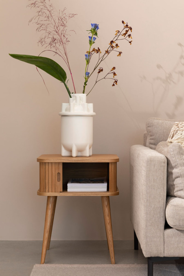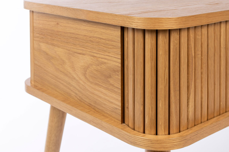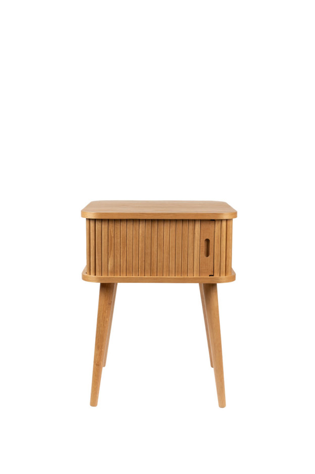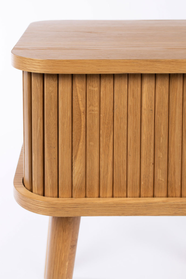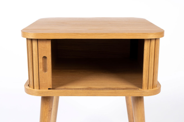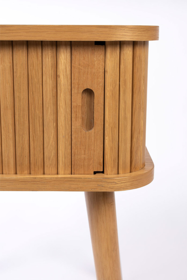 Nuestra mesa auxiliar Barbier tiene la estructura de MDF chapado en roble de 18 mm. La puerta de persiana y las patas son de madera maciza de roble.