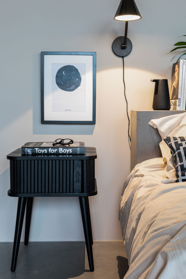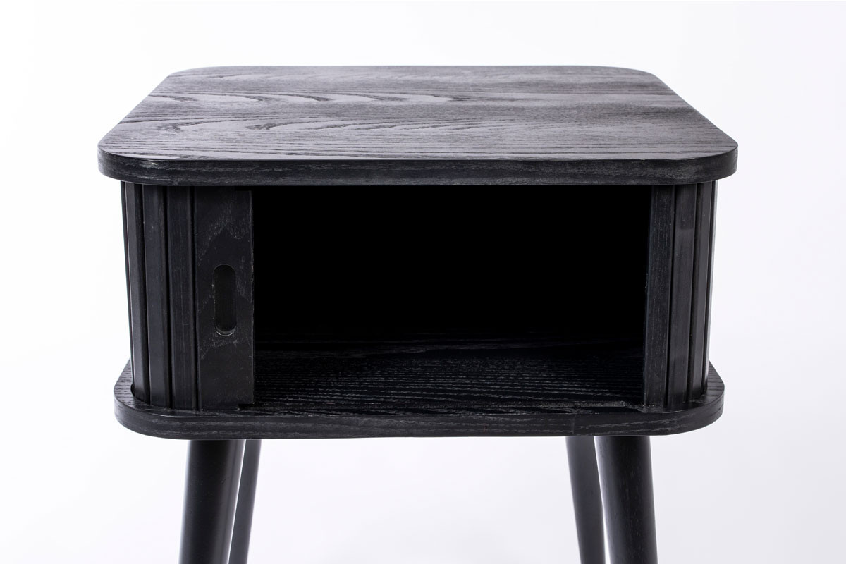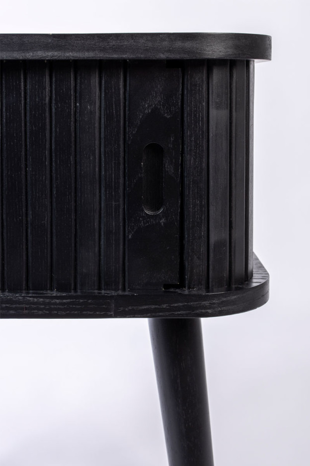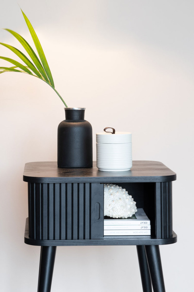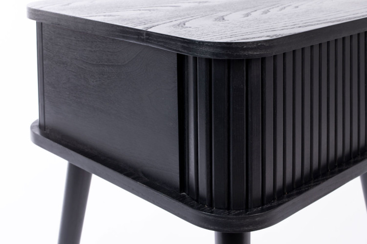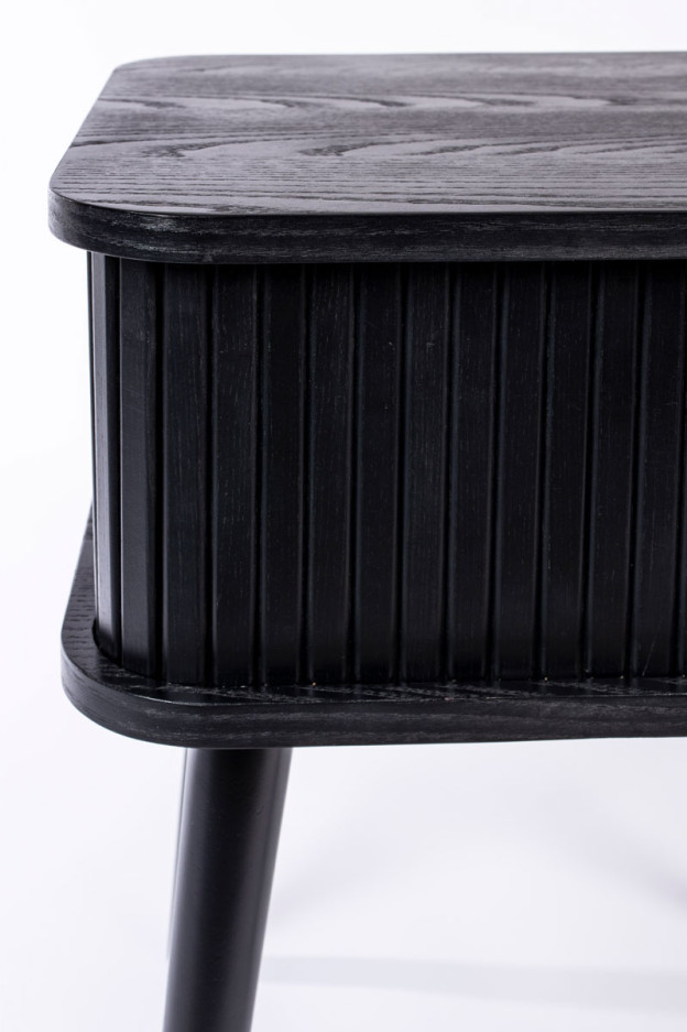 Nuestra mesa auxiliar Barbier tiene la estructura de MDF chapado en roble de 18 mm. La puerta de persiana y las patas son de madera maciza de roble.