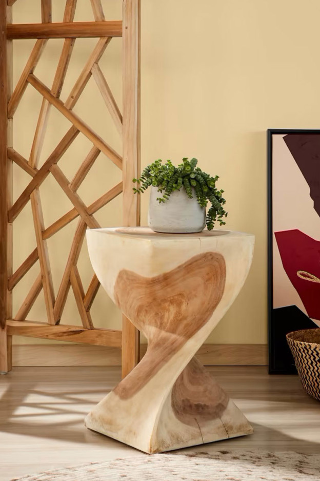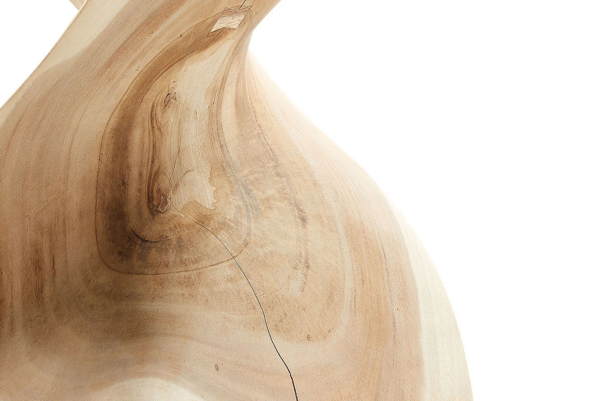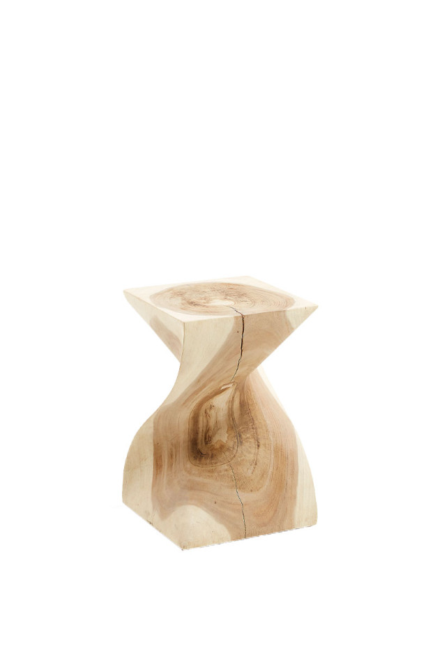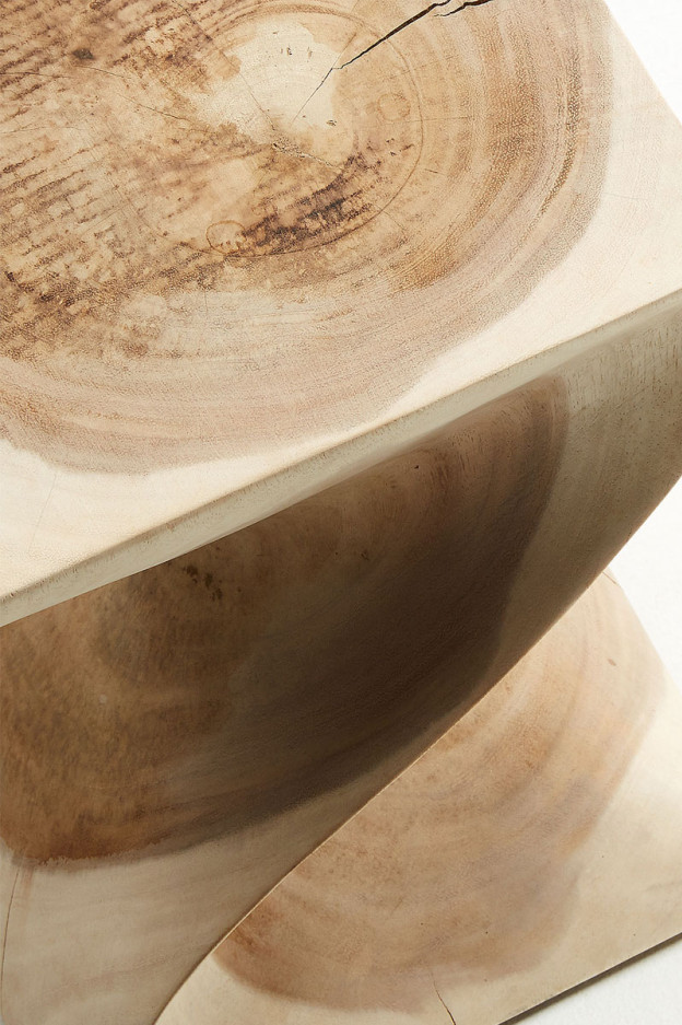 Mesa auxiliar realizada en madera maciza de mungur en acabado natural. Su forma cuadrada en la superficie y sus formas sinuosas formando una espiral hacia la base la convierten en un diseño único sin quitarle ni un ápice de funcionalidad.