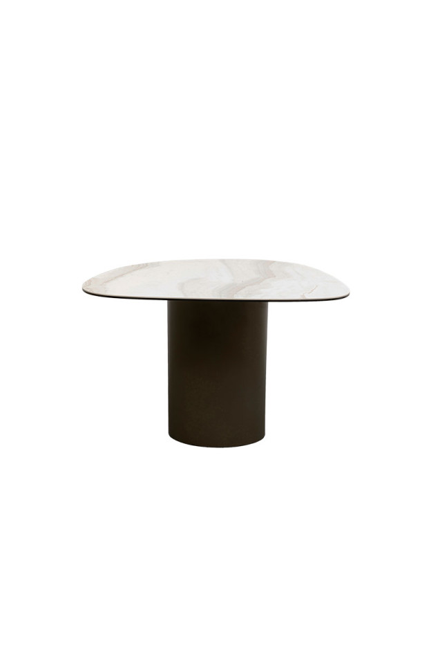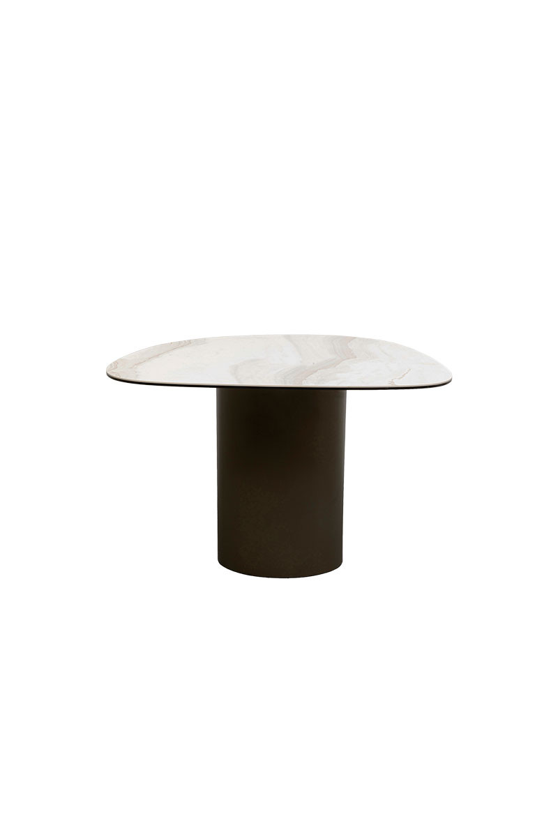 La base se encuentra fabricada en acero, y el sobre en vidrio y gres.