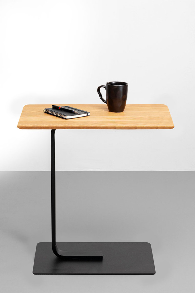 La estructura de la mesa está fabricada en acero, y el sobre en madera maciza de roble.