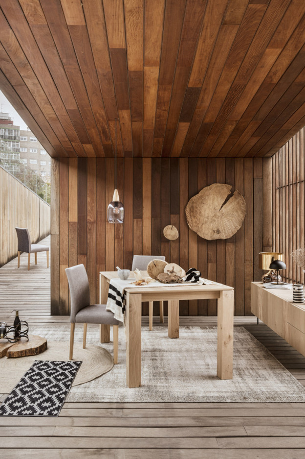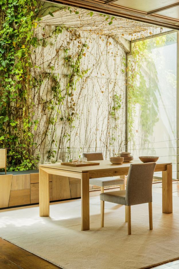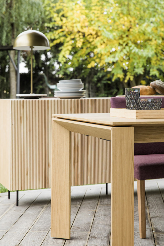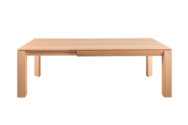 Nuestra mesa Chiara puede ser fija o extensible, las patas de extensión llevan unas ruedas para que puedas abrirla fácilmente y los extensibles siempre son de madera chapada aunque el sobre sea cerámico.