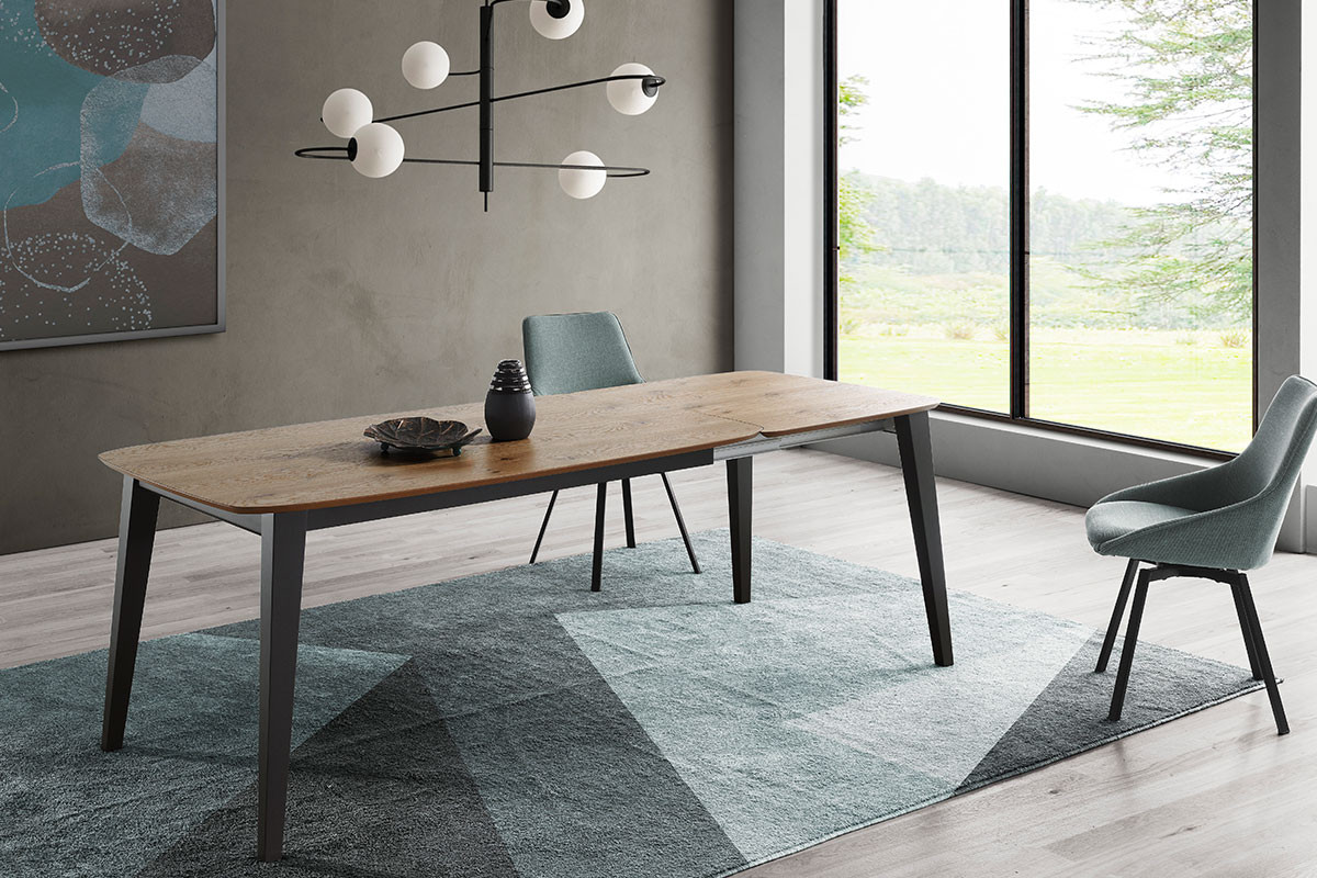 Nuestra mesa Tonne es extensible, con un extensible de 70 cm. La apertura del extensible es mediante bastidor de aluminio anodizado con patines de acero y rodamientos de nylon con ruedas ocultas en las patas que se extienden. Las mesas con acabado porcelánico llevan el extensible lacado en mate a juego con la tapa.