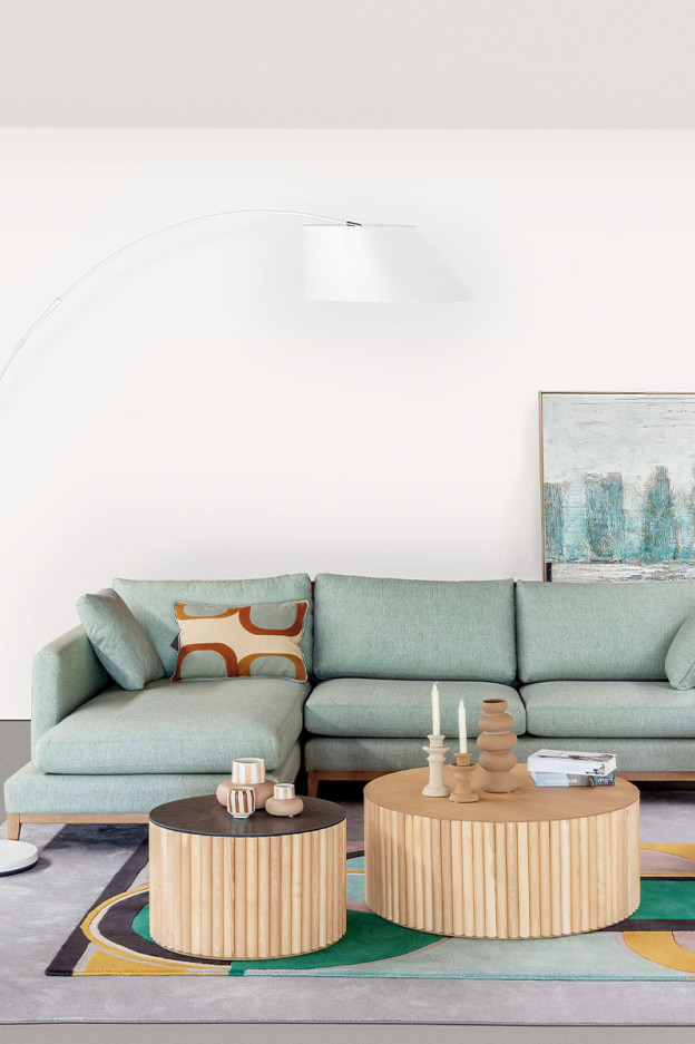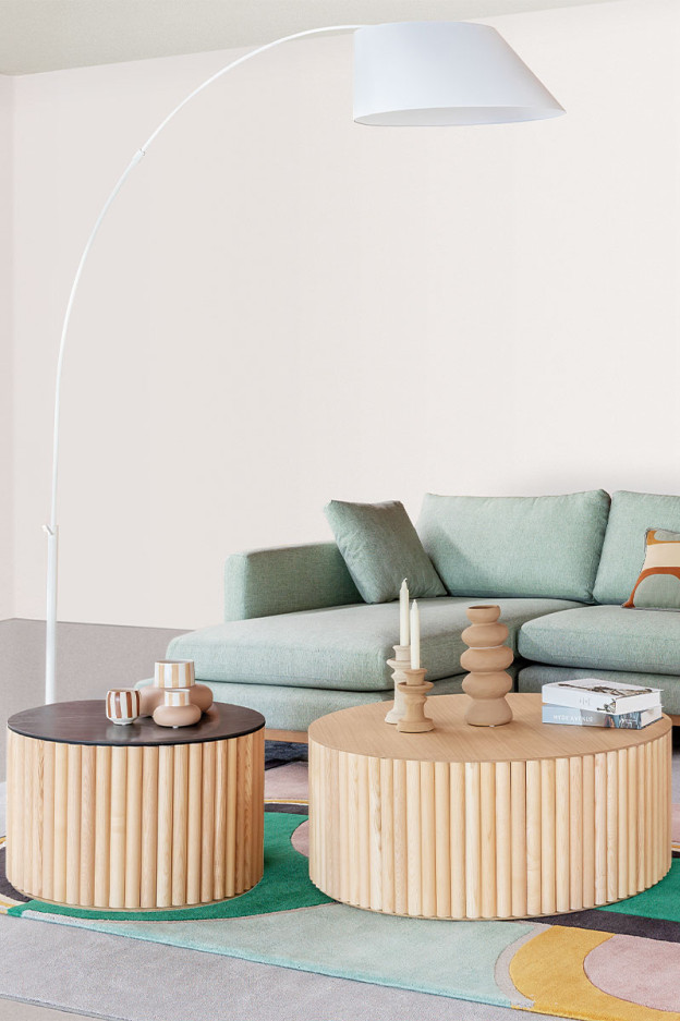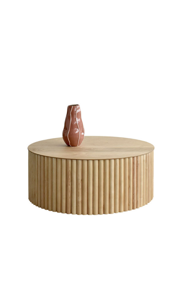 Nuestra mesa de centro Viena es redonda, tiene el pie central con listones verticales de madera maciza de fresno en acabado roble o nogal. El sobre es de fibra de madera natural chapada y está disponible en varios acabados de madera, lacados o porcelánicos.