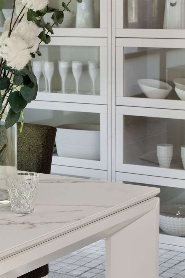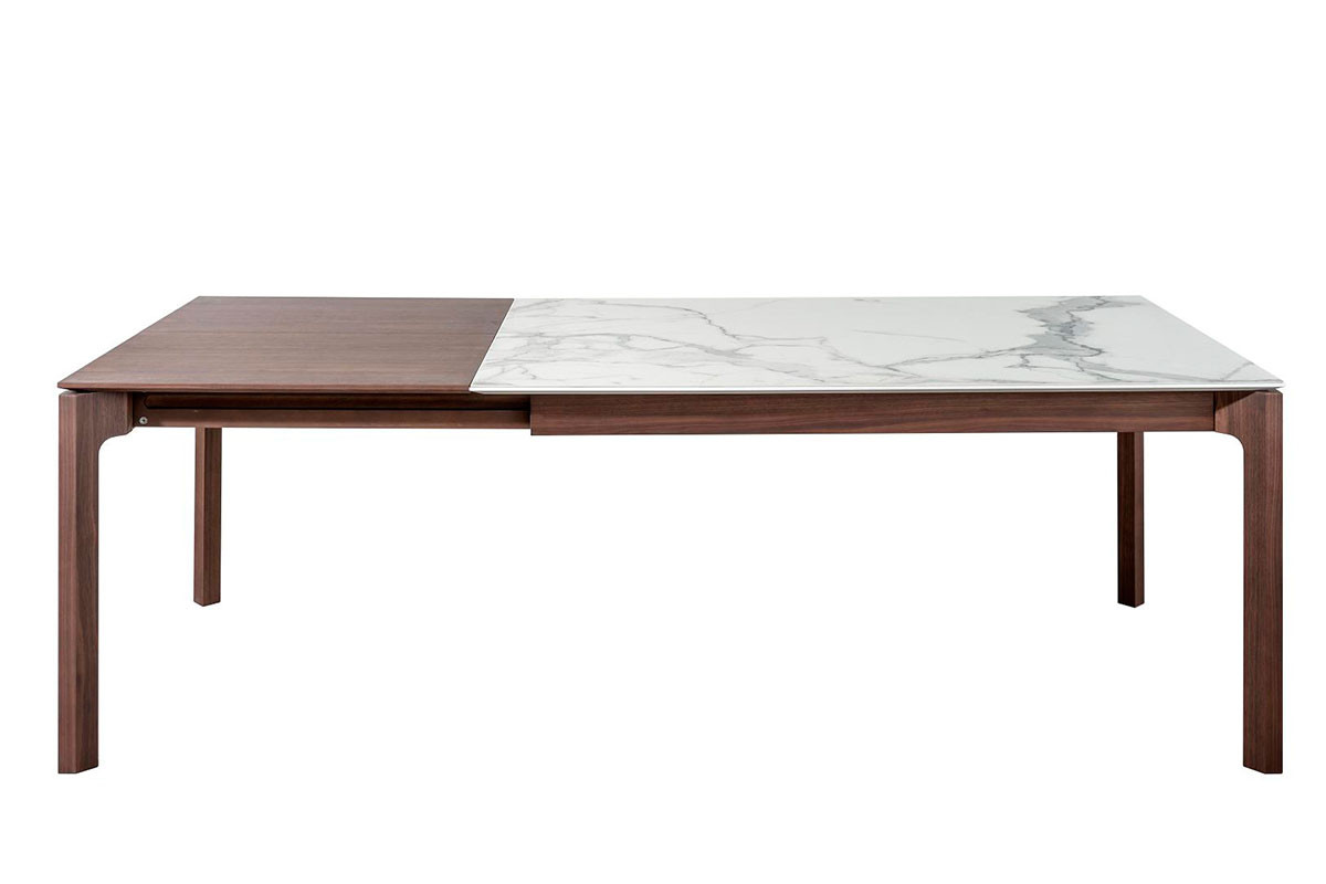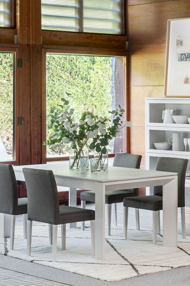 Nuestra mesa Mercury puede ser fija o extensible, las patas de extensión llevan unas ruedas para que puedas abrirla fácilmente y los extensibles siempre son en madera chapada aunque el sobre sea cerámico.