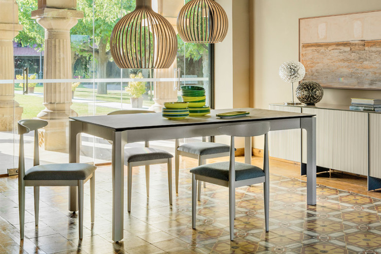 Nuestra mesa Mercury puede ser fija o extensible, las patas de extensión llevan unas ruedas para que puedas abrirla fácilmente.