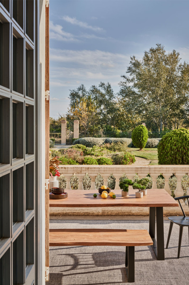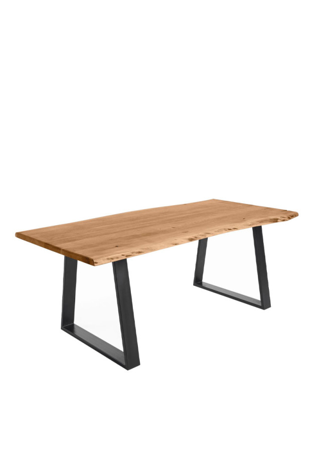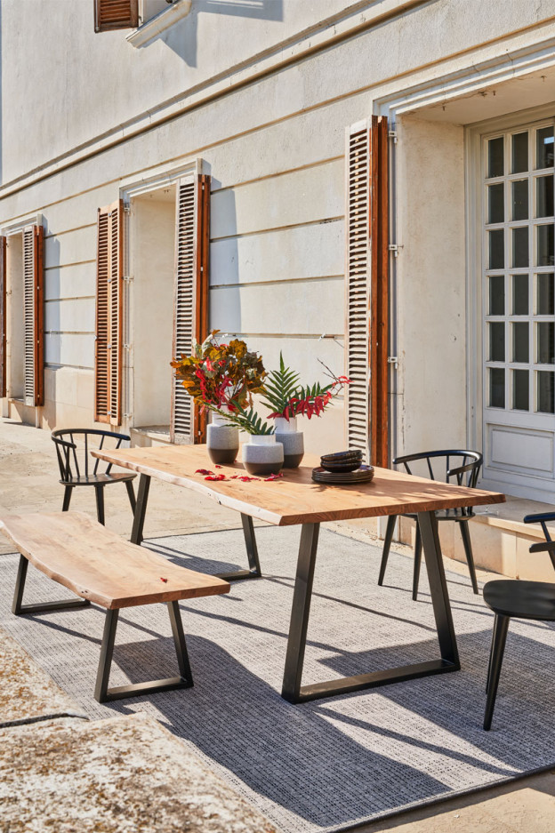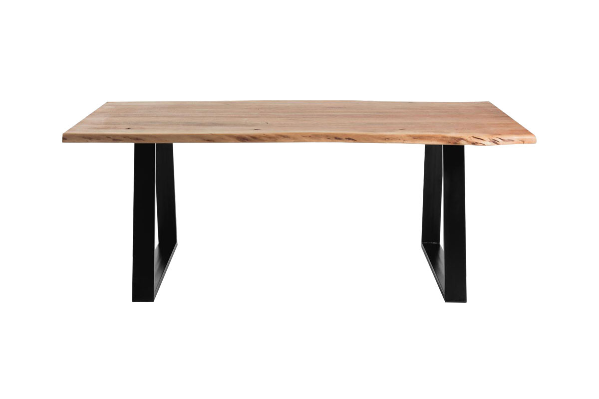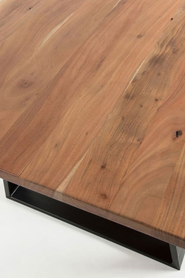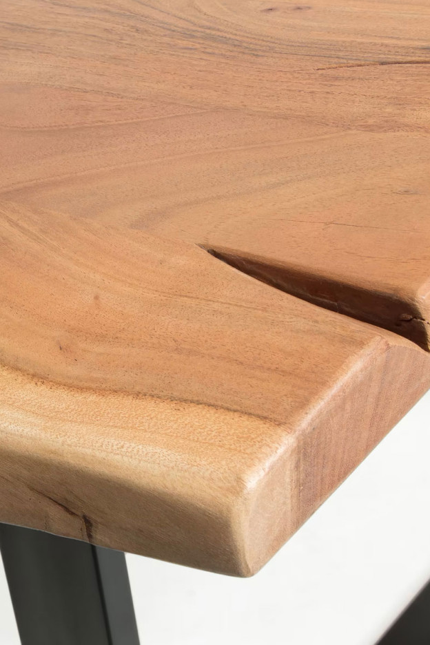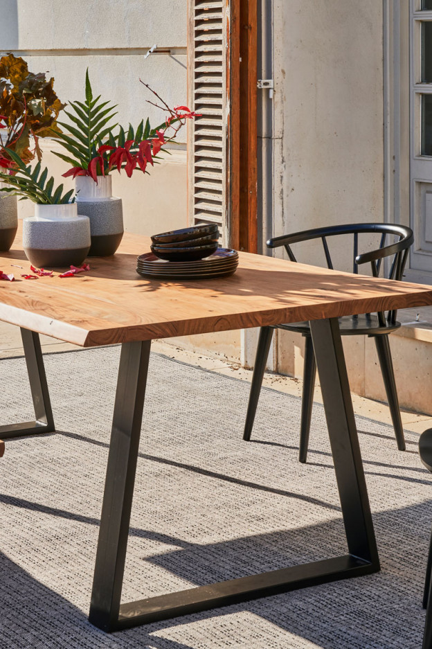 Mesa con sobre en madera maciza de acacia natural. Patas de metal en color negro.