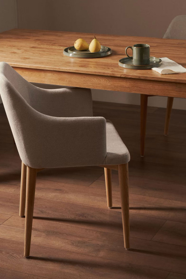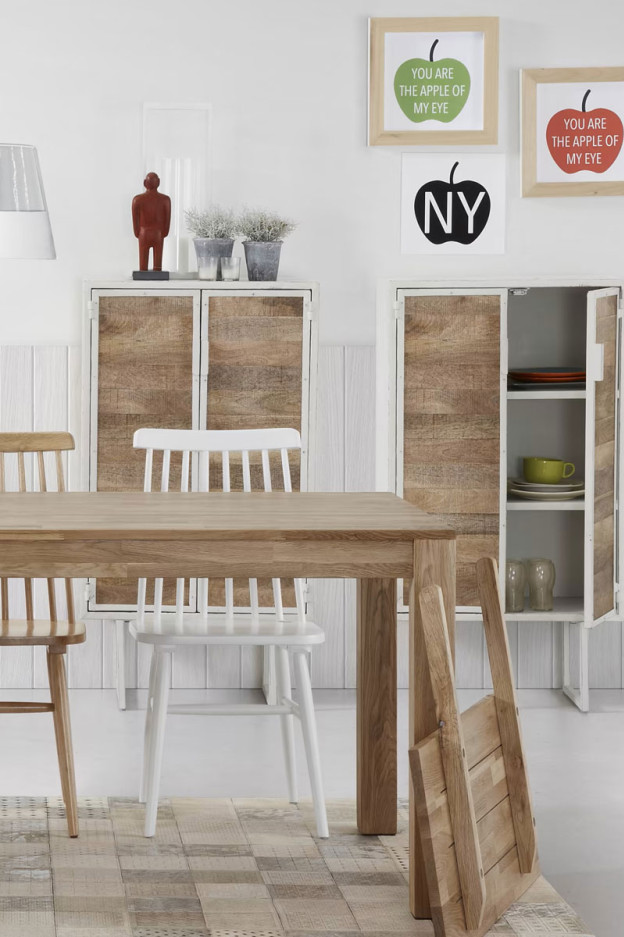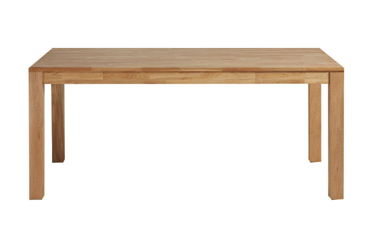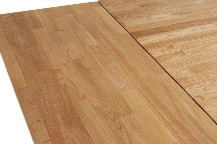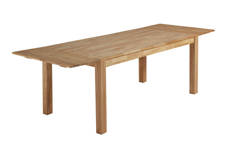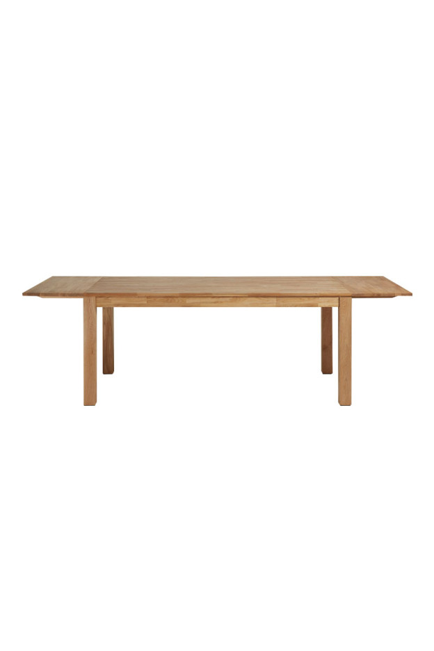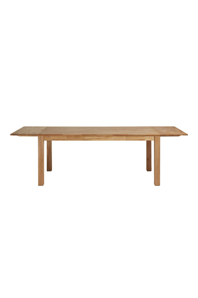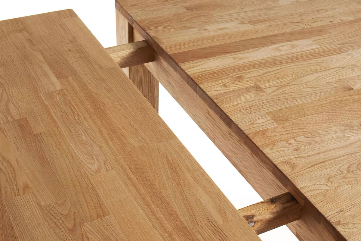 Mesa extensible con patas y sobre en roble macizo y acabado natural.