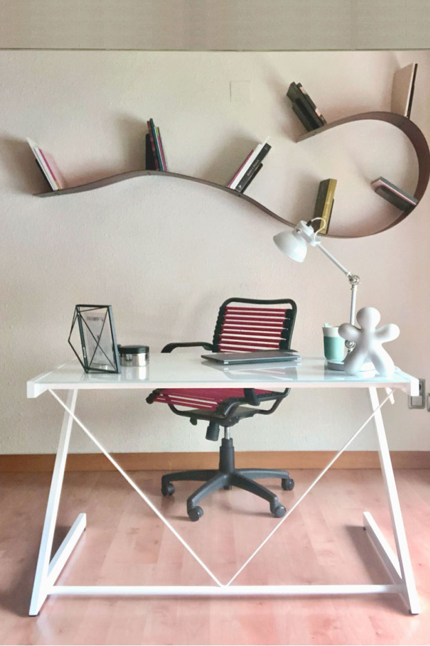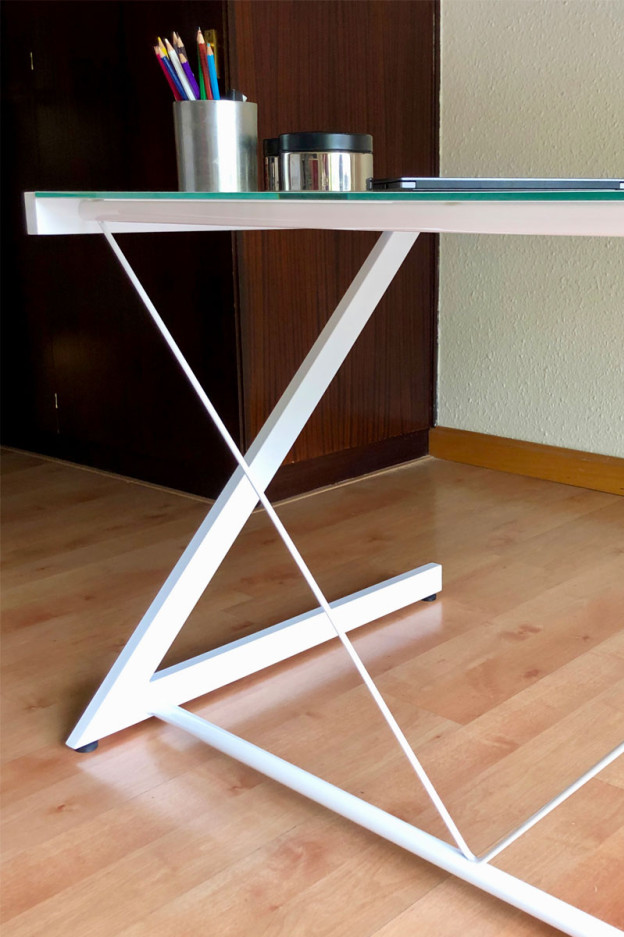 Nuestra mesa de escritorio Z Line tiene la estructura de acero lacado en color blanco y el sobre es de vidrio óptico de 8 mm de grosor también en color blanco.