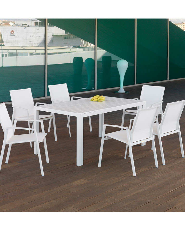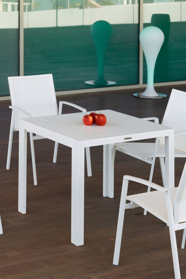 Nuestra mesa de exterior Mijas es de aluminio termolacado, material de gran resistencia a la intemperie y de sencilla limpieza, disponible en color blanco o topo.