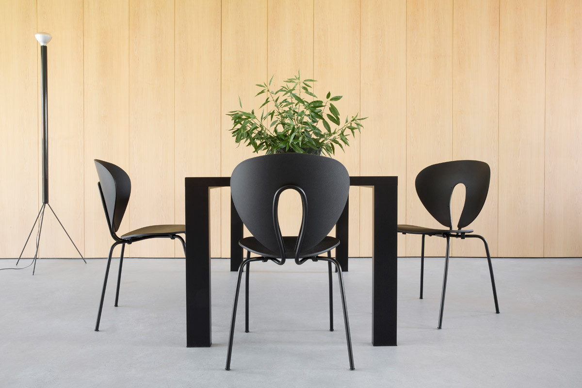 Mesa con estructura de aluminio anodizado mate o aluminio anodizado lacado en blanco o negro. Sobre DM lacado en blanco o con chapa de madera en roble, nogal o fresno teñido de color negro. Tornillería de acero inoxidable. Producto para uso interior. Diseño de Jesús Gasca.