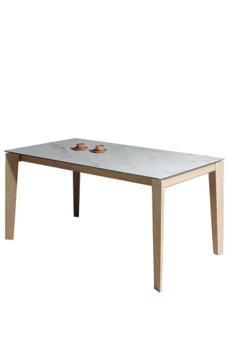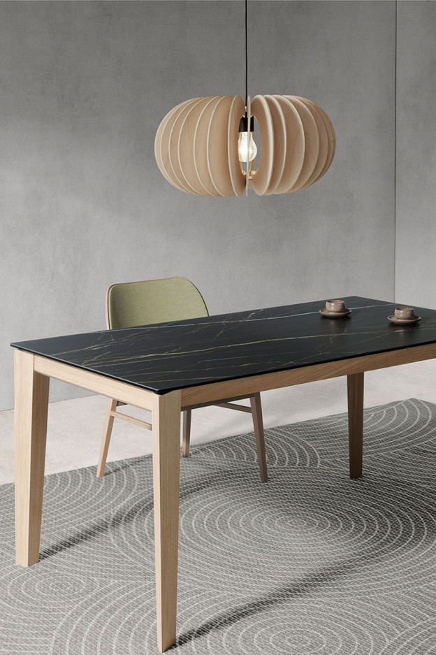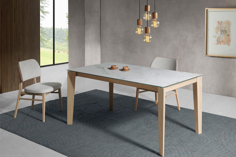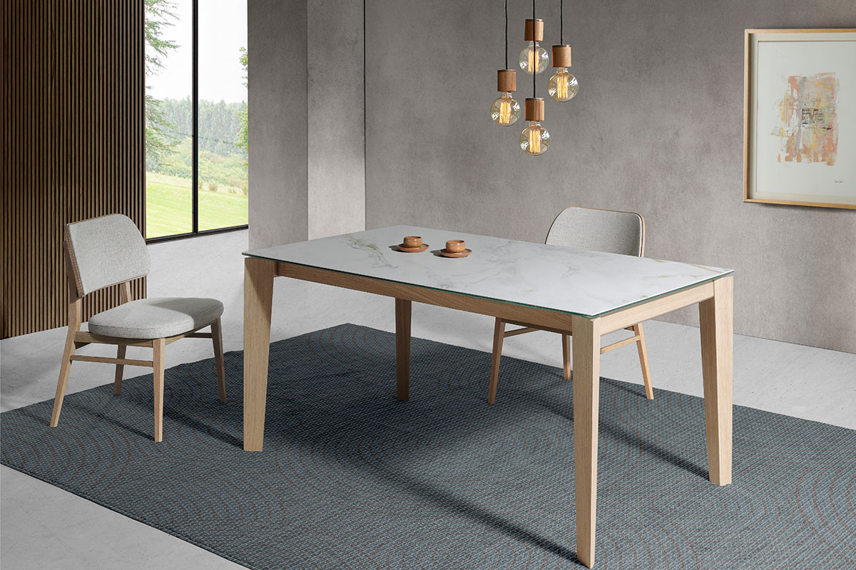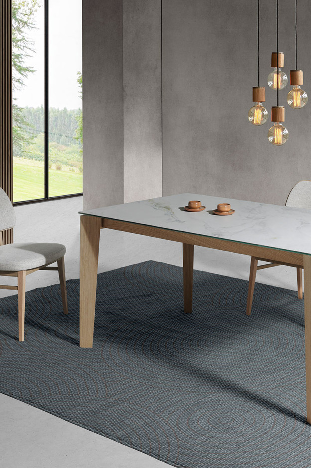 Nuestra mesa Geo tiene las patas de madera de haya y está disponible en varios acabados, el sobre puede ser de madera en fibra chapada o lacada con bisel de 19 mm, cristal de 10 mm de grosor o porcelánico de 3 mm sobre cristal de 8 mm, todos en varios acabados para que puedas elegir el que más te guste o más se adapte a la decoración de tu hogar.