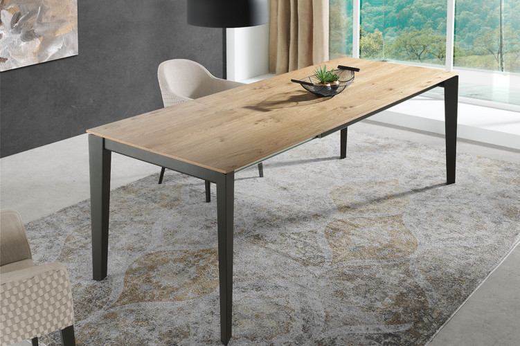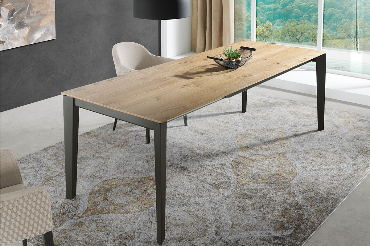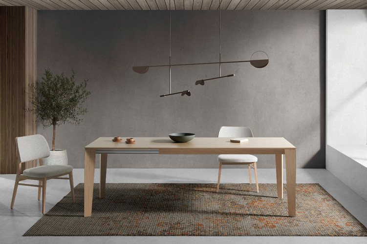 Geo es extensible, con un extensible de 70 cm o dos extensibles de 50 cm. La apertura del extensible es mediante bastidor de aluminio anodizado con patines de acero y rodamientos de nylon con ruedas ocultas en las patas que se extienden. Las mesas con acabado de cristal o porcelánico llevan el extensible lacado en mate a juego con la tapa.