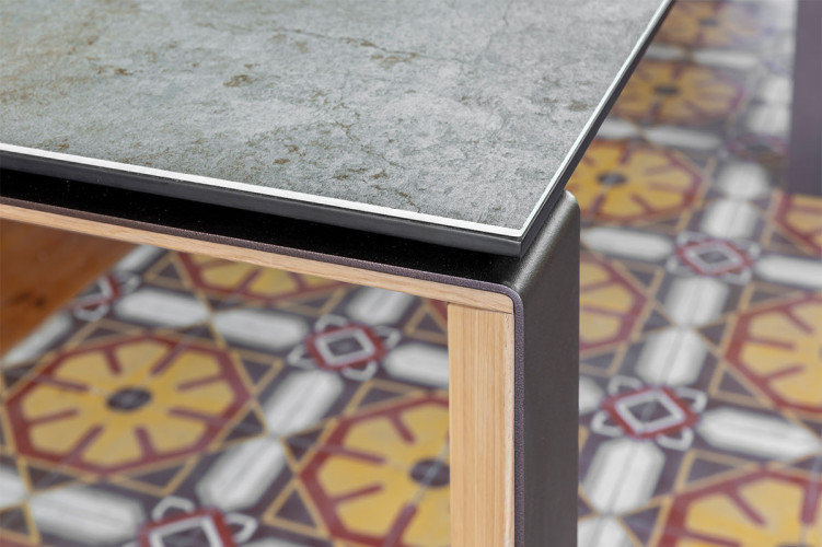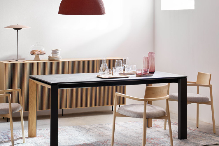 Elegancia y durabilidad con nuestra mesa Liat, Liat cuenta con un diseño que aporta calidez y sofisticación gracias a su bastidor metálico y a la combinación de su pata con metal y madera en acabado roble o en acabado nogal.